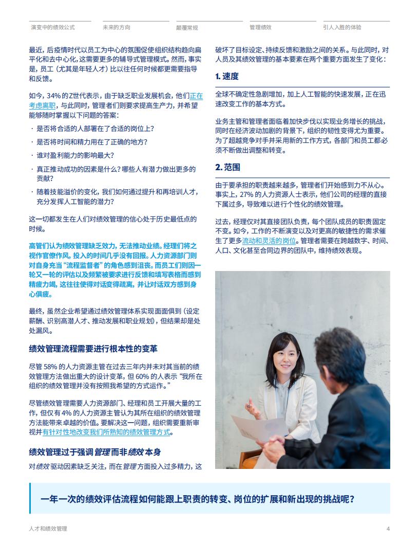 作,但仅有4%的人力资源主管认为其所在组织的绩效管理方法能带来卓越的价值。要解决这一问题,组织需要重新审视并有针对性地改变我们所熟知的绩效管理方式。