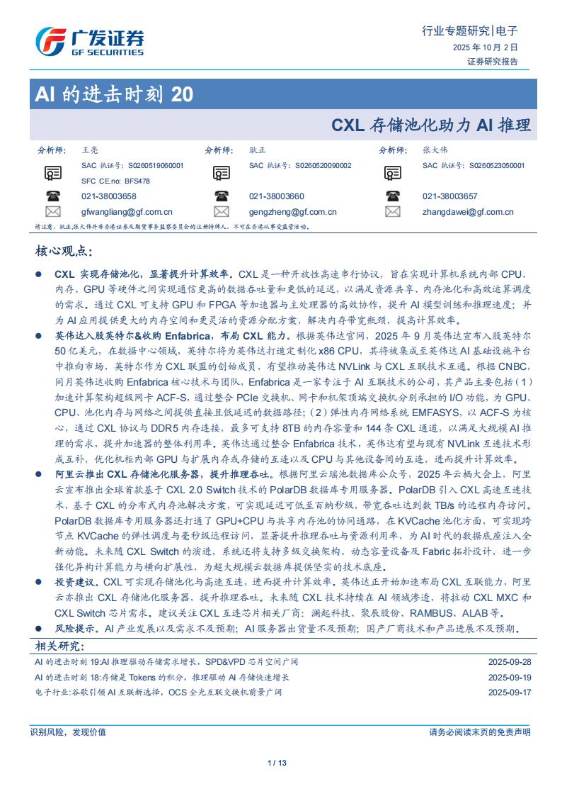 云亦推出CXL存储池化服务器,提升推理吞吐。未来随CXL技术持续在AI领域渗透,将拉动CXL MXC和CXL Switch芯片需求。建议关注CXL互连芯片相关厂商:澜起科技、聚辰股份、RAMBUS、ALAB等。