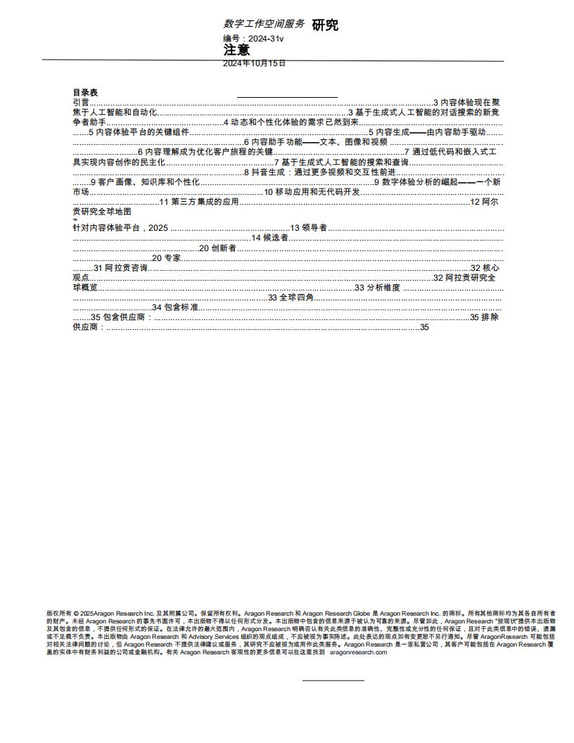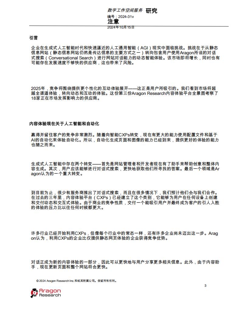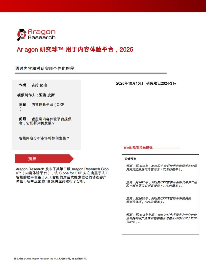 2025年,竞争将围绕提供更个性化的互动体验展开——这正是用户所吸引的。我们看到市场将超越全渠道体验,转向动态和互动的体验。这份第三份Aragon Research内容体验平台全景图考察了18家正在市场发挥影响力的供应商。