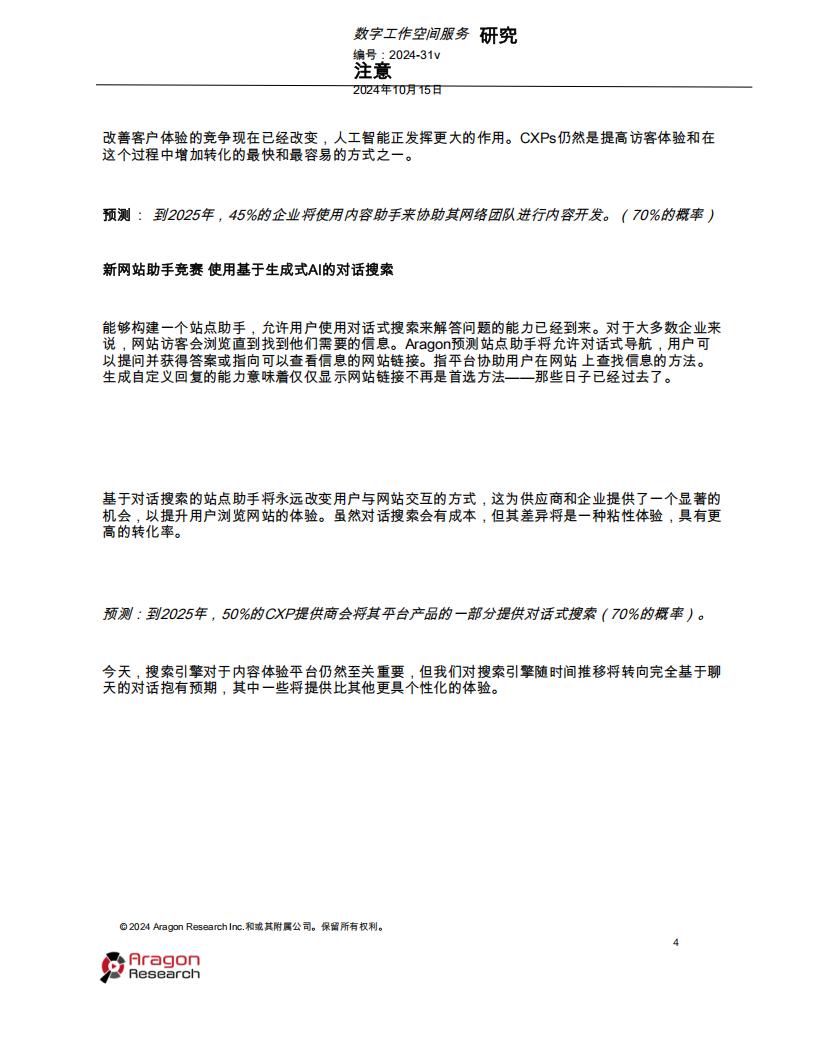 企业在生成式人工智能时代和快速逼近的人工通用智能(AGI)现实中面临挑战。挑战在于从静态信息网站(静态信息网站仍然是传达信息的主要方式之一)转向包含用户使用Aragon所说的对话式搜索(Conversational Search)进行网站对话能力的动态智能体验。该市场即将增长,同时也有可能存在发展速度不够快的供应商,这也带来了风险。