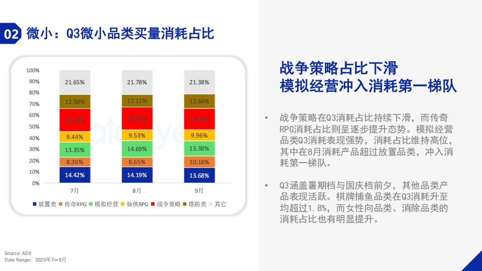 Q3涵盖暑期档与国庆档前夕,其他品类产品表现活跃。棋牌捕鱼品类在Q3消耗升至均超过1.8%,而女性向品类、消除品类的消耗占比也有明显提升。