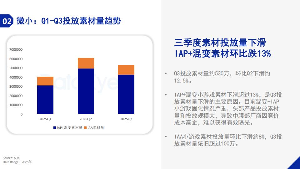 IAA小游戏素材投放量环比下滑约8%,Q3投放素材量依旧超过100万。