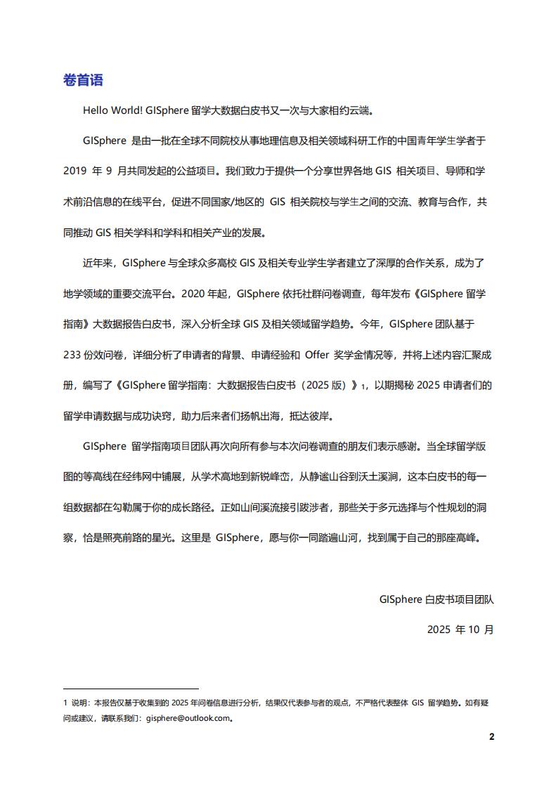 近年来,GISphere与全球众多高校GIS及相关专业学生学者建立了深厚的合作关系,成为了地学领域的重要交流平台。2020年起,GISphere依托社群问卷调查,每年发布《GISphere留学指南》大数据报告白皮书,深入分析全球GIS及相关领域留学趋势。今年,GISphere团队基于233份效问卷,详细分析了申请者的背景、申请经验和Offer奖学金情况等,并将上述内容汇聚成册,编写了《GISphere留学指南:大数据报告白皮书(2025版)》1,以期揭秘2025申请者们的留学申请数据与成功诀窍,助力后来者们扬帆出海,抵达彼岸。
