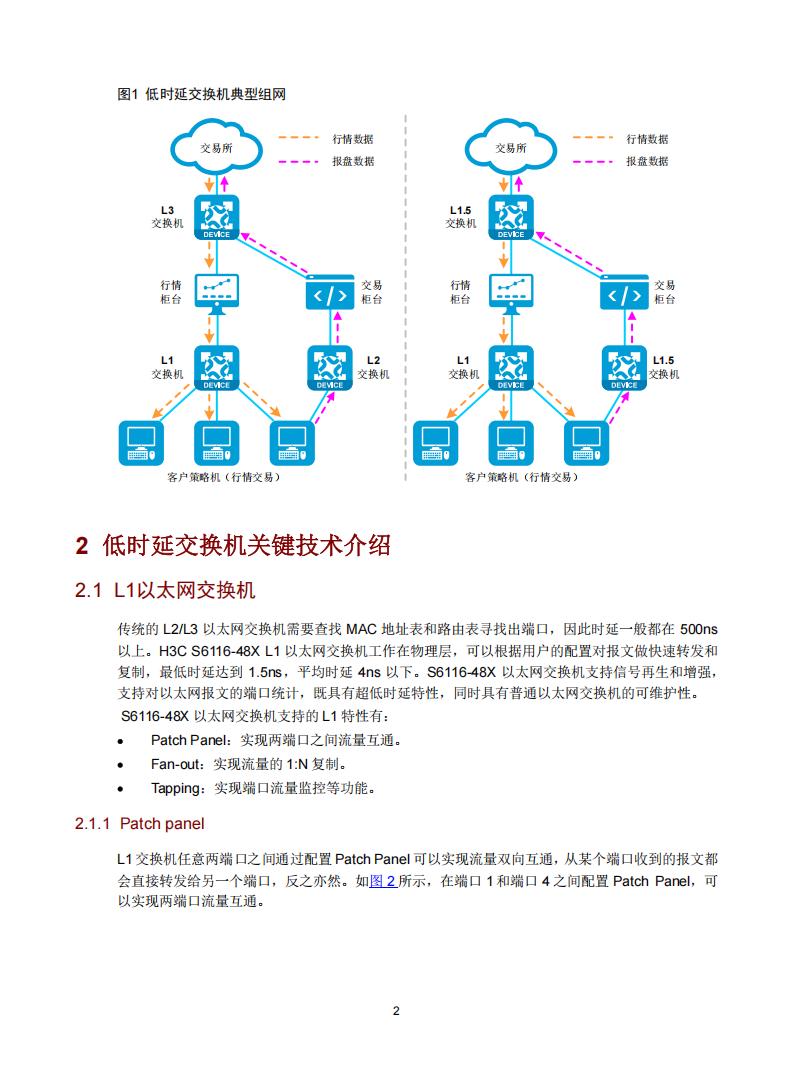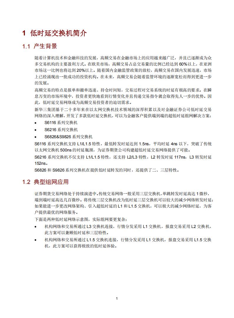 证券期货交易网络处于持续演进中。传统交易网络一般采用三层交换机,单跳转发时延高达1微秒,端到端时延高达几百微秒。将传统三层交换机改为低时延三层交换机可以较大的减少网络转发时延;如果能进一步更改网络架构、引入超低时延的L1和L1.5交换机,可以极大的减少网络时延,为客户提供最优的网络服务。