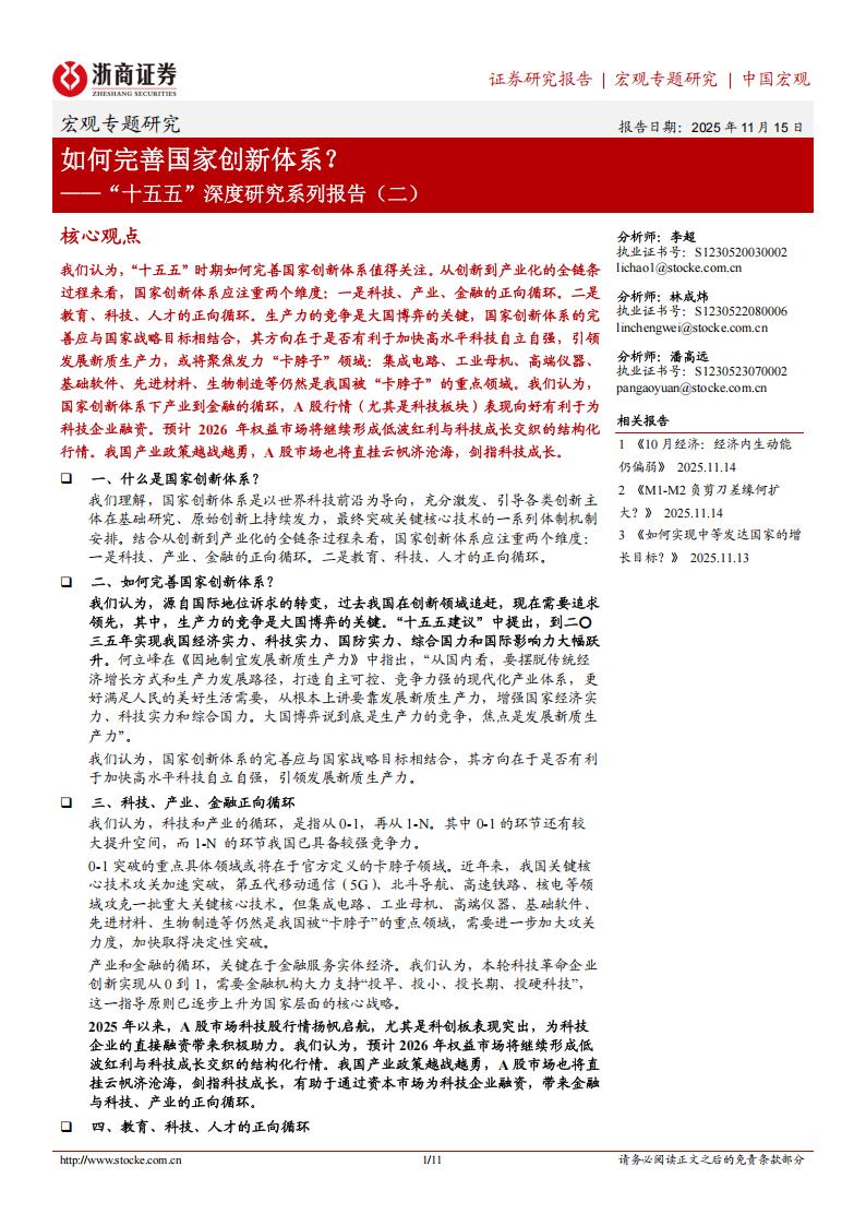 我们认为,“十五五”时期如何完善国家创新体系值得关注。从创新到产业化的全链条过程来看,国家创新体系应注重两个维度:一是科技、产业、金融的正向循环。二是教育、科技、人才的正向循环。生产力的竞争是大国博弈的关键,国家创新体系的完善应与国家战略目标相结合,其方向在于是否有利于加快高水平科技自立自强,引领发展新质生产力,或将聚焦发力“卡脖子”领域:集成电路、工业母机、高端仪器、基础软件、先进材料、生物制造等仍然是我国被“卡脖子”的重点领域。我们认为,国家创新体系下产业到金融的循环,A股行情(尤其是科技板块)表现向好有利于为科技企业融资。预计2026年权益市场将继续形成低波红利与科技成长交织的结构化行情。我国产业政策越战越勇,A股市场也将直挂云帆济沧海,剑指科技成长。