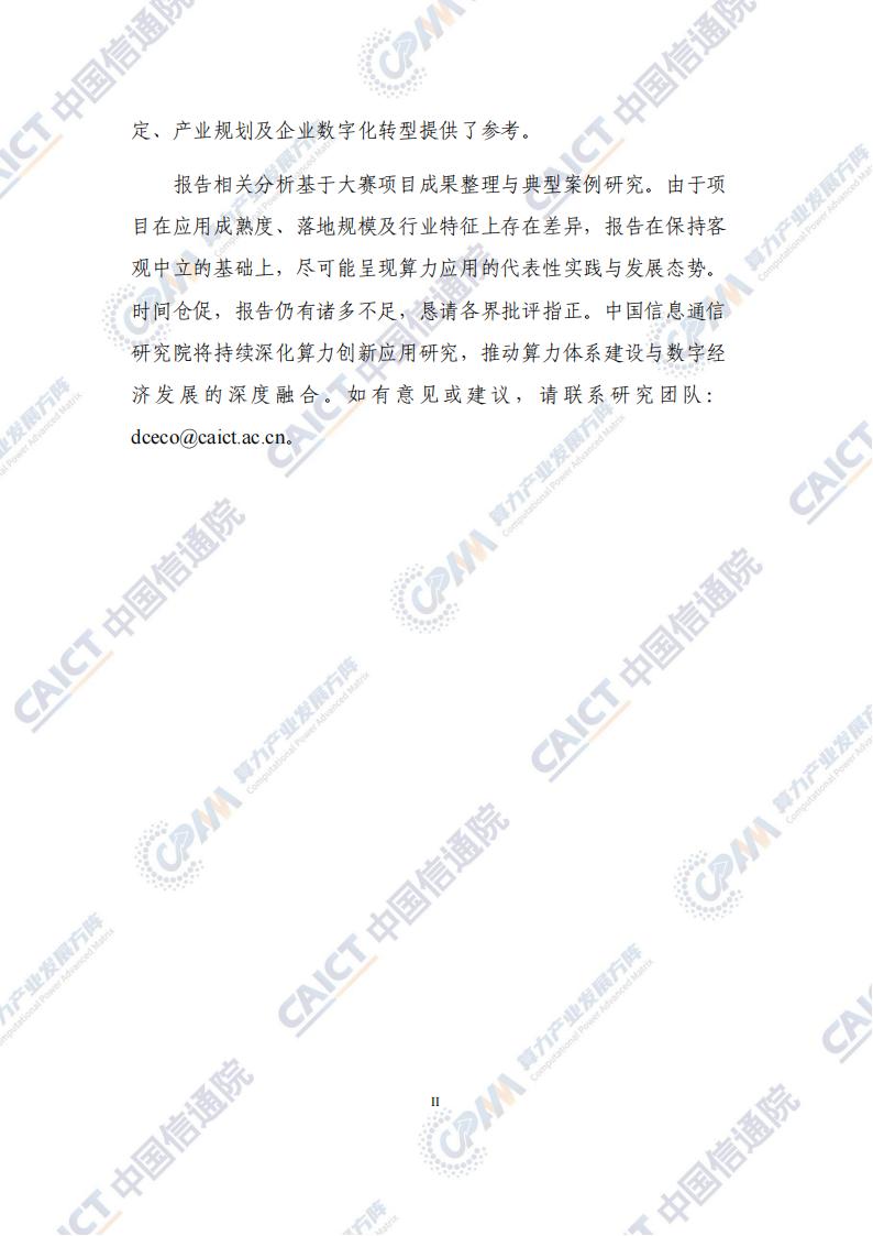 报告相关分析基于大赛项目成果整理与典型案例研究。由于项目在应用成熟度、落地规模及行业特征上存在差异,报告在保持客观中立的基础上,尽可能呈现算力应用的代表性实践与发展态势。时间仓促,报告仍有诸多不足,恳请各界批评指正。中国信息通信研究院将持续深化算力创新应用研究,推动算力体系建设与数字经济发展的深度融合。如有意见或建议,请联系研究团队:dceco@caict.ac.cn。