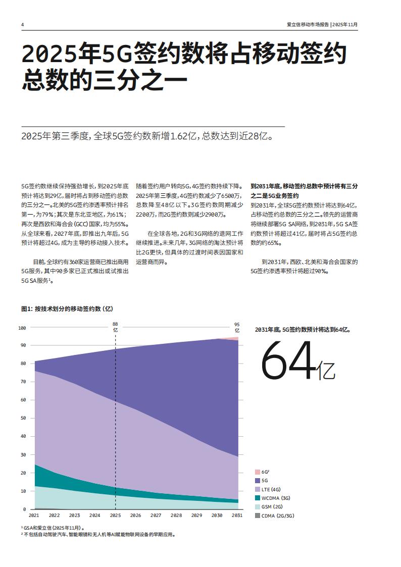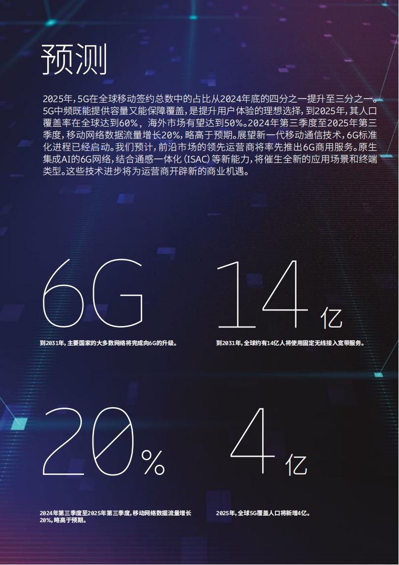 到2025年年底,5G签约数预计将达到29亿,约占全球移动签约总数的三分之一。2025年,全球5G覆盖人口将新增4亿。5G承载的流量占比持续攀升,到2031年,全球将有超过12亿人通过5G固定无线接入(FWA)技术享受宽带服务。5G服务正在深刻影响世界各地人们的生活。日