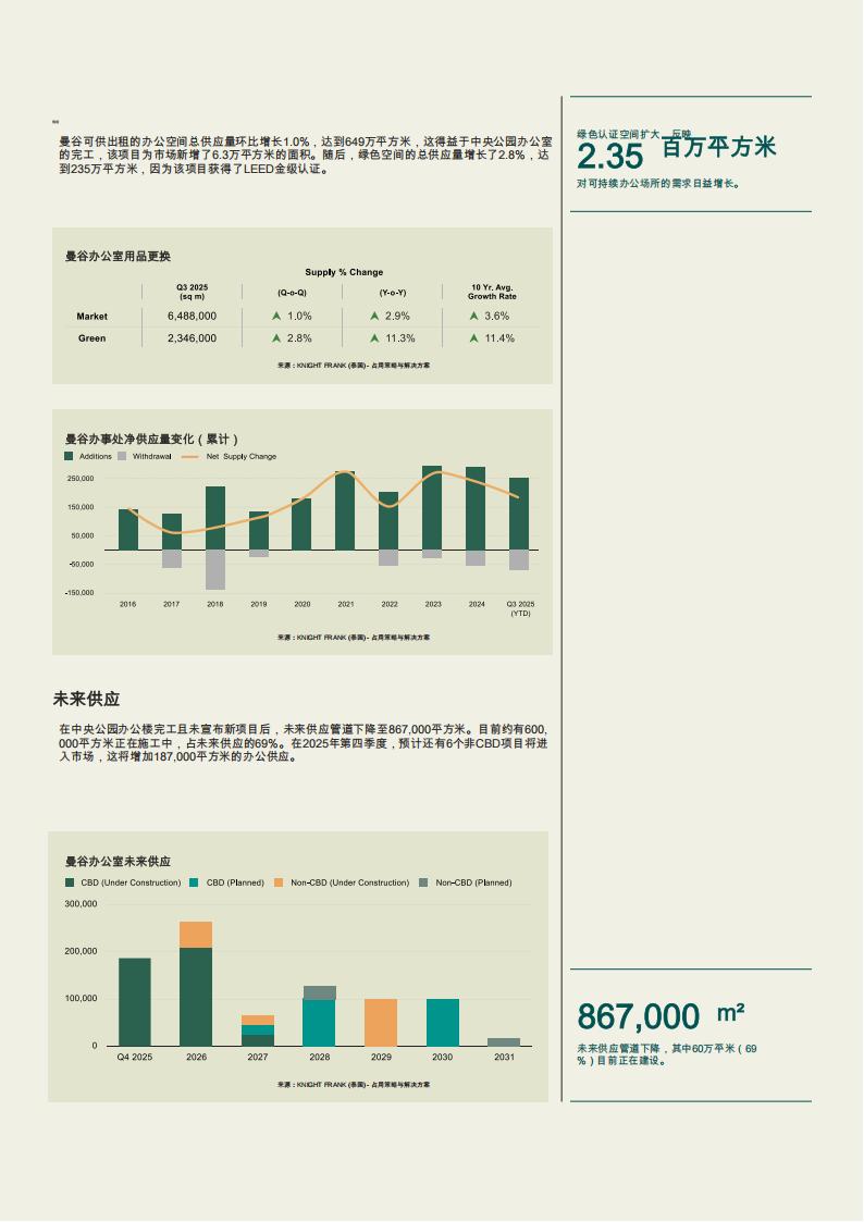 在中央公园办公楼完工且未宣布新项目后,未来供应管道下降至867,000平方米。目前约有600,000平方米正在施工中,占未来供应的69%。在2025年第四季度,预计还有6个非CBD项目将进入市场,这将增加187,000平方米的办公供应。