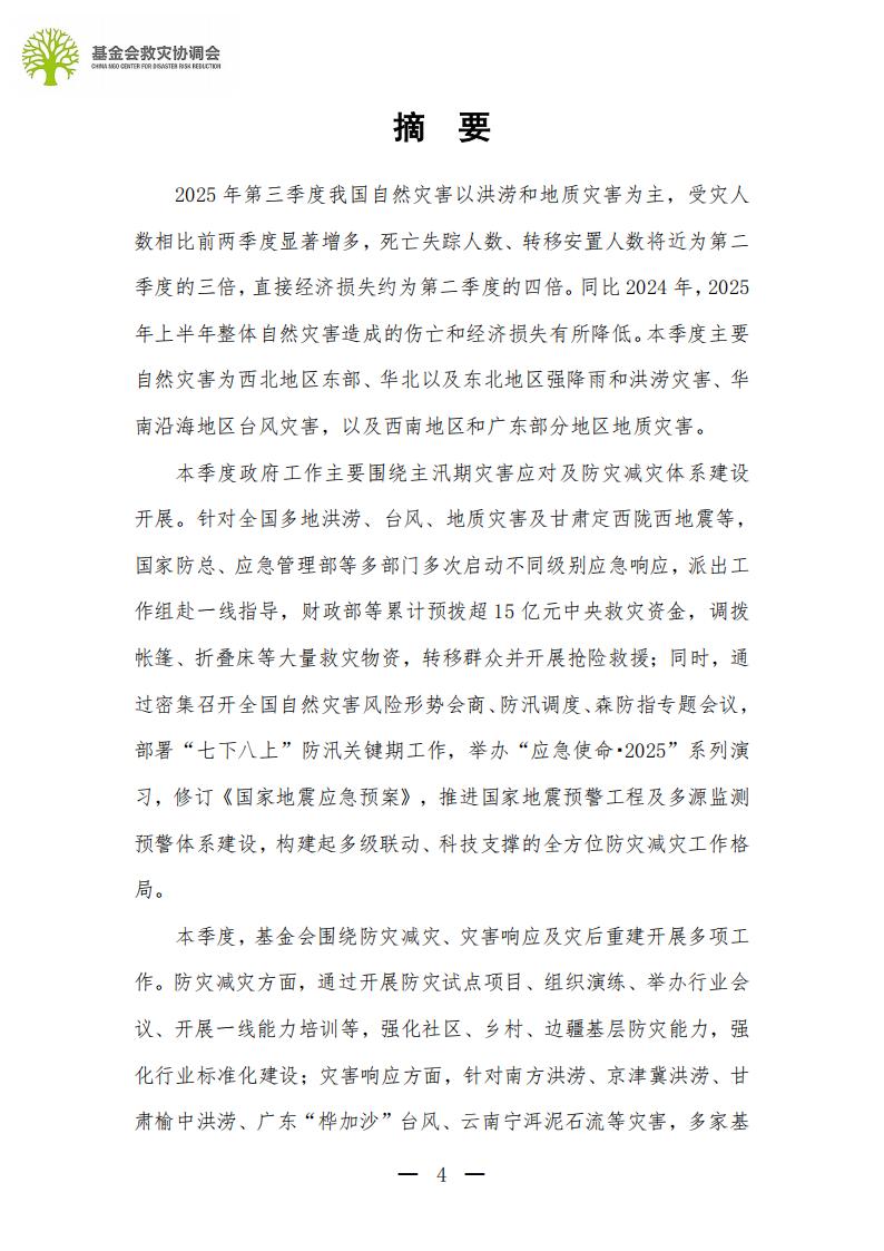 本季度,基金会围绕防灾减灾、灾害响应及灾后重建开展多项工作。防灾减灾方面,通过开展防灾试点项目、组织演练、举办行业会议、开展一线能力培训等,强化社区、乡村、边疆基层防灾能力,强化行业标准化建设;灾害响应方面,针对南方洪涝、京津冀洪涝、甘肃榆中洪涝、广东“桦加沙”台风、云南宁洱泥石流等灾害,多家基金会联合政、企、社等多元主体力量,提供人道救援箱、饮用水、温暖包等物资援助,开展社区消杀、群众转移,运用数字关爱金、电子赈济券等数字化工具保障受灾群众生活;灾后重建阶段,聚焦西藏定日地震、贵州榕江从江洪涝、甘肃榆中洪涝等灾区,通过支持清淤、开展以工代赈、建设灾后儿童服务站、举办公益节活动等,助力灾区恢复生产生活秩序与社区活力。