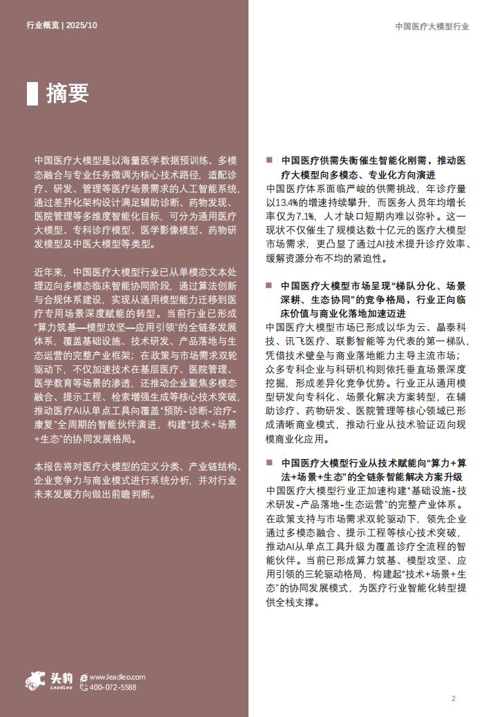 本报告将对医疗大模型的定义分类、产业链结构、企业竞争力与商业模式进行系统分析,并对行业未来发展方向做出前瞻判断。