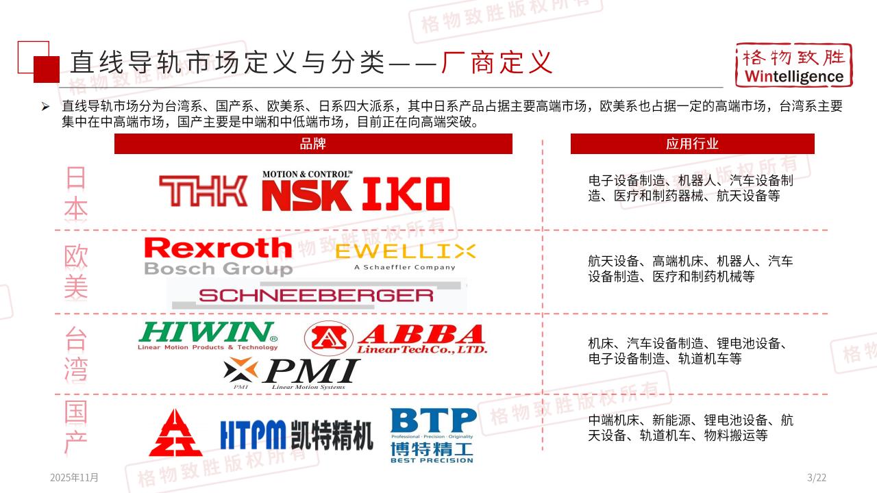 本系(THK.NSK、IKO等)、欧美系(Rexroth、SCHNEEBERGER等)、台湾系(HIWIN、ABBA.PMI等)企业占据技术优势,国产系(HTPM凯特精机、博特精工等)也在加速崛起,行业产能分布呈现多区域竞争态势