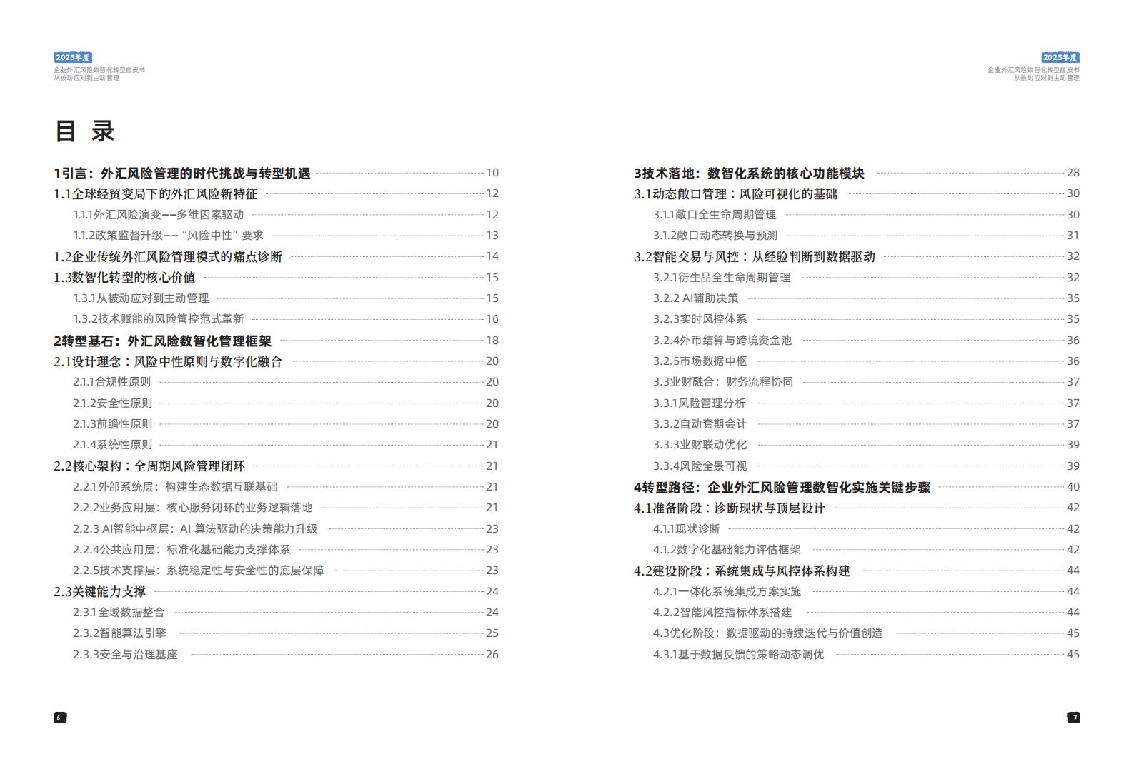 本白皮书聚焦“企业外汇风险数智化转型”的核心议题,系统梳理了当前企业在外汇风险管理中面临的痛点与挑战,全面阐述了数智化转型的理论基础、架构设计与关键技术路径,并通过多个行业领先案例,深入剖析技术落地的实践经验与价值成效。我们希望通过本白皮书,向监管机构、企业管理者、科研机构及技术服务商提供有益的参考与借鉴,共同推动我国企业外汇管理体系的高质量转型升级。
