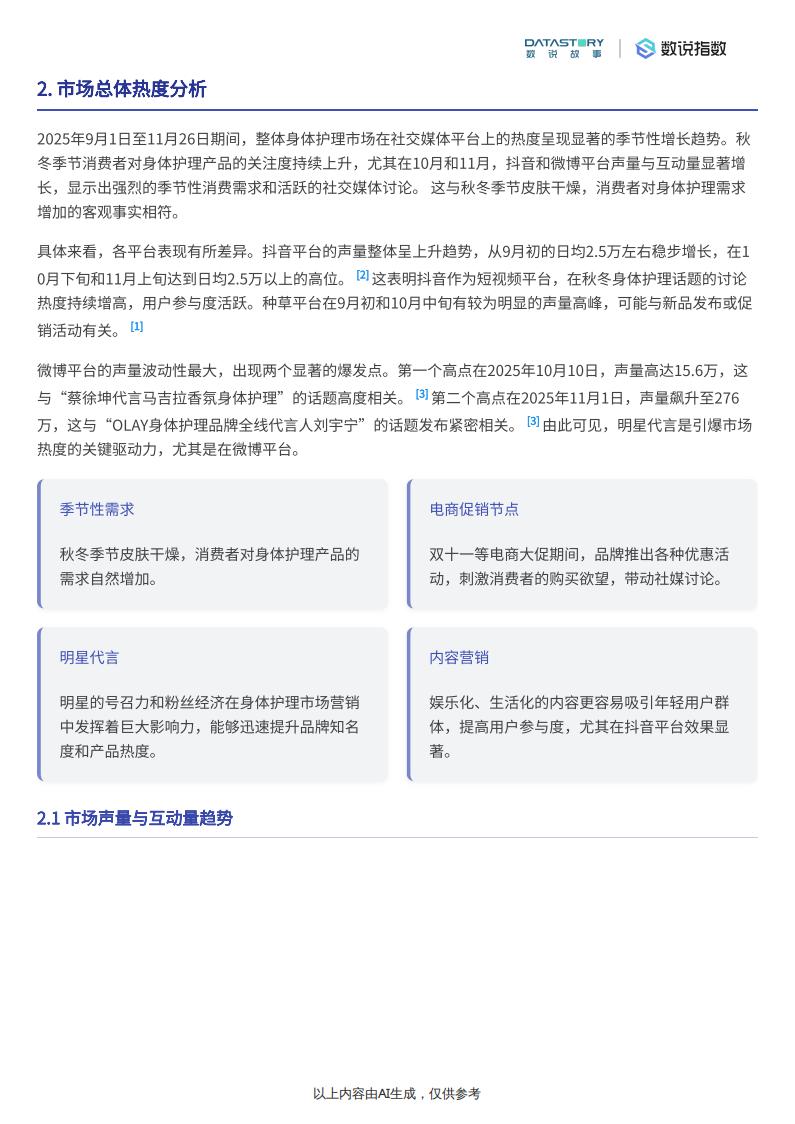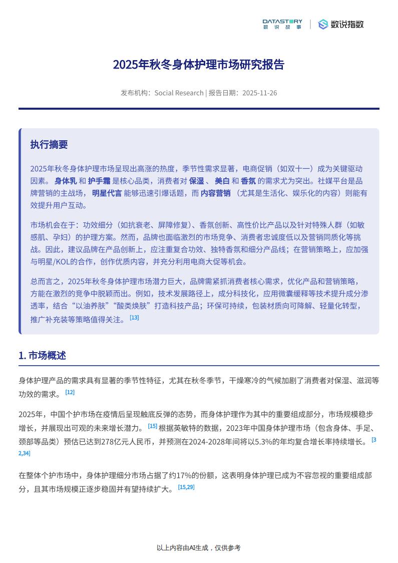 2025年秋冬身体护理市场呈现出高涨的热度,季节性需求显著,电商促销(如双十一)成为关键驱动因素。身体乳和护手霜是核心品类,消费者对保湿、美白和香氛的需求尤为突出。社媒平台是品牌营销的主战场,明星代言能够迅速引爆话题,而内容营销(尤其是生活化、娱乐化的内容)则能有效提升用户互动。