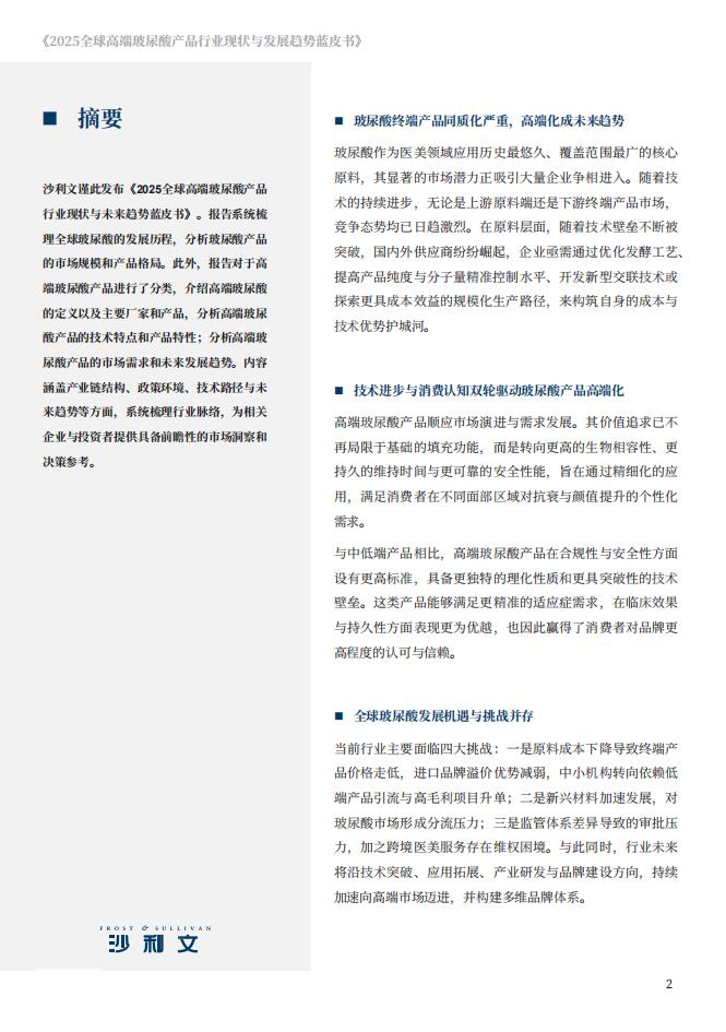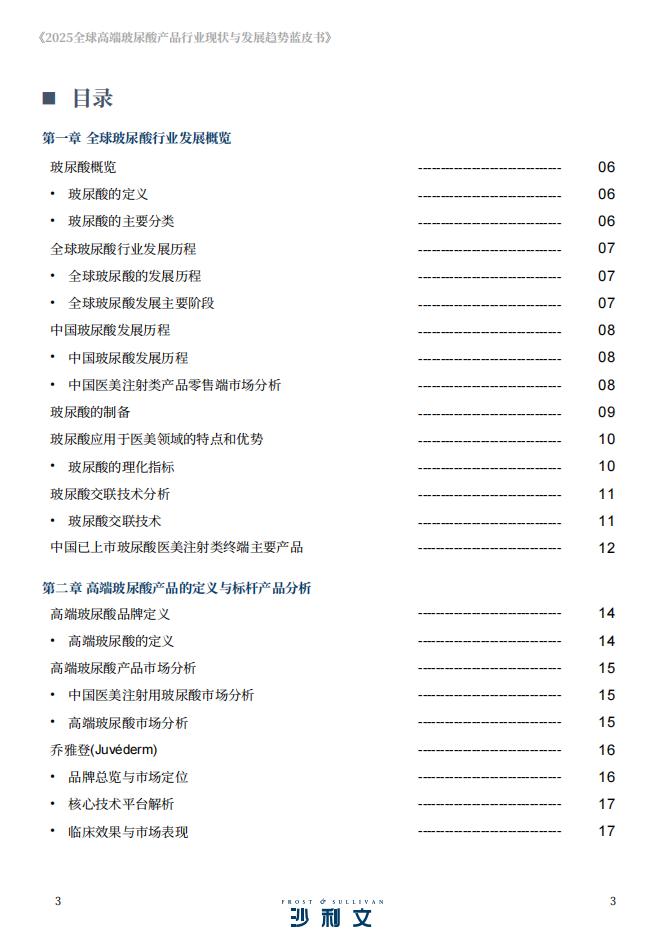 沙利文谨此发布《2025全球高端玻尿酸产品行业现状与未来趋势蓝皮书》。报告系统梳理全球玻尿酸的发展历程,分析玻尿酸产品的市场规模和产品格局。此外,报告对于高端玻尿酸产品进行了分类,介绍高端玻尿酸的定义以及主要厂家和产品,分析高端玻尿酸产品的技术特点和产品特性;分析高端玻尿酸产品的市场需求和未来发展趋势。内容涵盖产业链结构、政策环境、技术路径与未来趋势等方面,系统梳理行业脉络,为相关企业与投资者提供具备前瞻性的市场洞察和