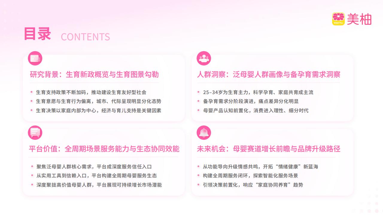 基于美柚平台内备孕育人群的真实行为数据,结合问卷调查数据,聚焦泛母婴群体,美柚联合厦门大学人口与生态研究所发布2025生育全景洞察。本报告旨在客观呈现新时代女性的生育观念与行为变迁,为行业伙伴提供趋势参考与服务建议,共同助力中国家庭实现更加科学、安心与温暖的孕育体验。