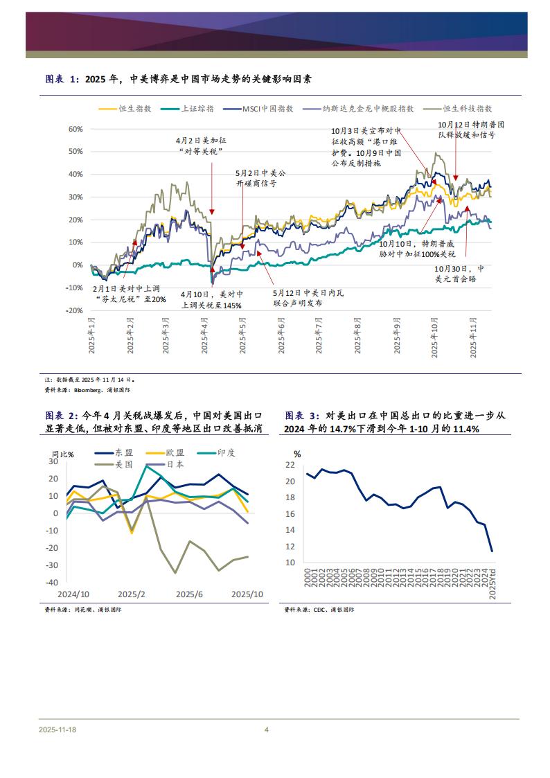 “斗而不破”的常态化意味着关税战的走向变得更加可预测。从经济角度来看,自特朗普二次上任后对中国商品加征关税以来,中国对美国的出口增速自今年4月起转负(图表2),平均同比增速跌至-26%左右,但这部分的影响被对东盟、印度等地区出口改善抵消。从年度数据来看,中国对美出口增速从2024年的4.9%转负到今年1-10月的-17.8%。对美国出口在中国总出口中的占比从2024年的14.7%下降到了2025年1-10月的11.4%(图表3)。