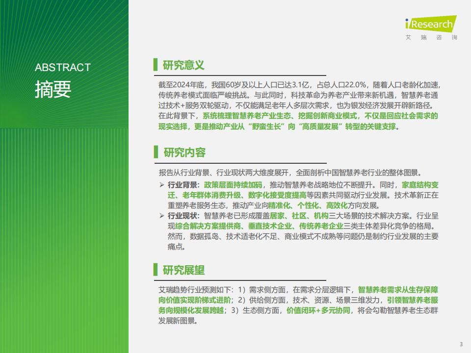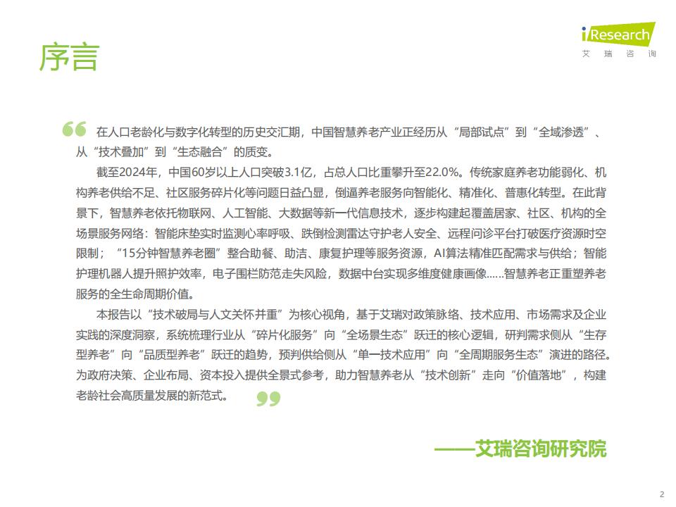 本报告以“技术破局与人文关怀并重”为核心视角,基于艾瑞对政策脉络、技术应用、市场需求及企业实践的深度洞察,系统梳理行业从“碎片化服务”向“全场景生态”跃迁的核心逻辑,研判需求侧从“生存型养老”向“品质型养老”跃迁的趋势,预判供给侧从“单一技术应用”向“全周期服务生态”演进的路径。为政府决策、企业布局、资本投入提供全景式参考,助力智慧养老从“技术创新”走向“价值落地”,构建老龄社会高质量发展的新范式。