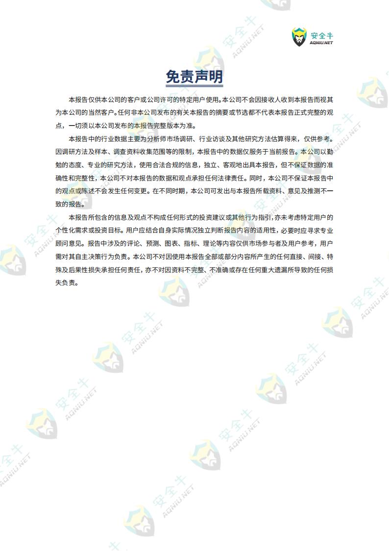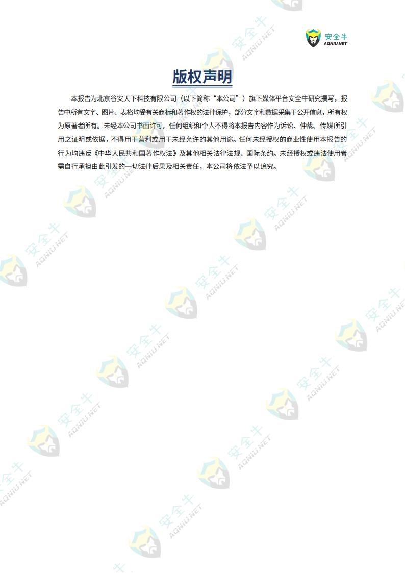本报告为北京谷安天下科技有限公司(以下简称“本公司”)旗下媒体平台安全牛研究撰写,报告中所有文字、图片、表格均受有关商标和著作权的法律保护,部分文字和数据采集于公开信息,所有权为原著者所有。未经本公司书面许可,任何组织和个人不得将本报告内容作为诉讼、仲裁、传媒所引用之证明或依据,不得用于营利或用于未经允许的其他用途。任何未经授权的商业性使用本报告的行为均违反《中华人民共和国著作权法》及其他相关法律法规、国际条约。未经授权或违法使用者需自行承担由此引发的一切法律后果及相关责任,本公司将依法予以追究。