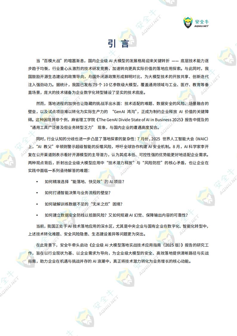 在此背景下,安全牛牵头启动《企业级AI大模型落地实战技术应用指南(2025版)》报告的研究工作,旨在以行业现状为基、以企业需求为导向,为企业级大模型的安全、高效落地提供清晰路径与实战指南,助力企业在机遇与挑战并存的AI浪潮中,真正将技术潜力转化为业务增长的核心动能。