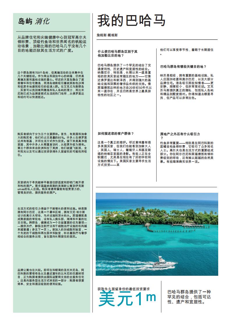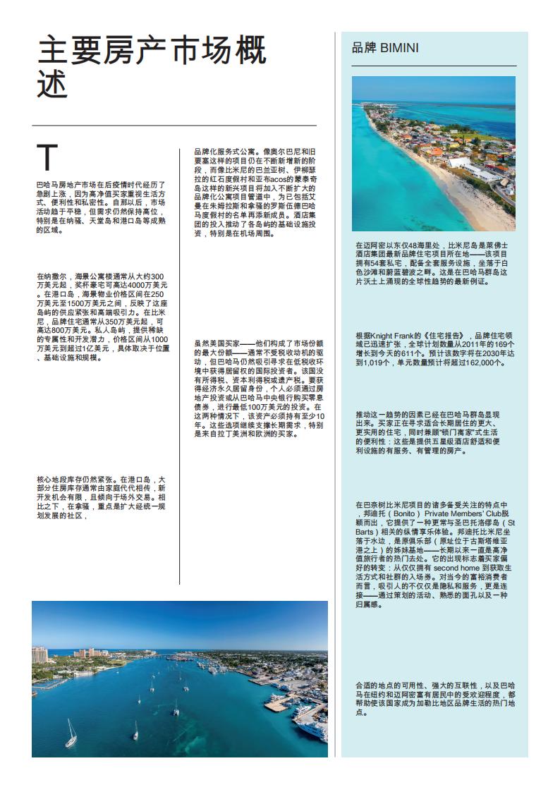 在迈阿密以东仅48海里处,比米尼岛是莱佛士根据Knight Frank的《住宅报告》,品牌住宅领推动这一趋势的因素已经在巴哈马群岛显现合适的地点的可用性、强大的互联性,以及巴哈酒店集团最新品牌住宅项目所在地——该项目域已迅速扩张,全球计划数量从2011年的169个出来。买家正在寻求适合长期居住的更大、马在纽约和迈阿密富有居民中的受欢迎程度,都拥有54套私宅,配备全套服务设施,坐落于白增长到今天的611个。预计该数字将在2030年达更实用的住宅,同时兼顾“锁门离家”式生活帮助使该国家成为加勒比地区品牌生活的热门地色沙滩和蔚蓝碧波之畔。这是在巴哈马群岛这到1,019个,单元数量预计将超过162,000个。的便利性:这些是提供五星级酒店舒适和便点。片沃土上涌现的全球性趋势的最新例证。利设施的有服务、有管理的房产。在巴奈树比米尼项目的诸多备受关注的特点中,邦迪托(Bonito)Private Members’Club脱颖而出,它提供了一种更常与圣巴托洛缪岛(StBarts)相关的纵情享乐体验。邦迪托比米尼坐落于水边,是原俱乐部(原址位于古斯塔维亚港之上)的姊妹基地——长期以来一直是高净值旅行者的热门去处。它的出现标志着买家偏好的转变:从仅仅拥有second home到获取生活方式和社群的入场券。对当今的富裕消费者而言,吸引人的不仅仅是隐私和服务,更是连接——通过策划的活动、熟悉的面孔以及一种归属感。