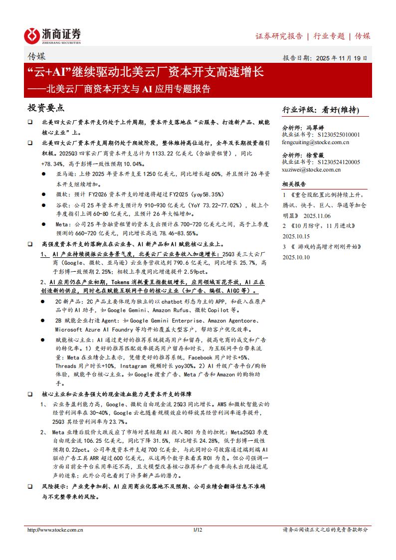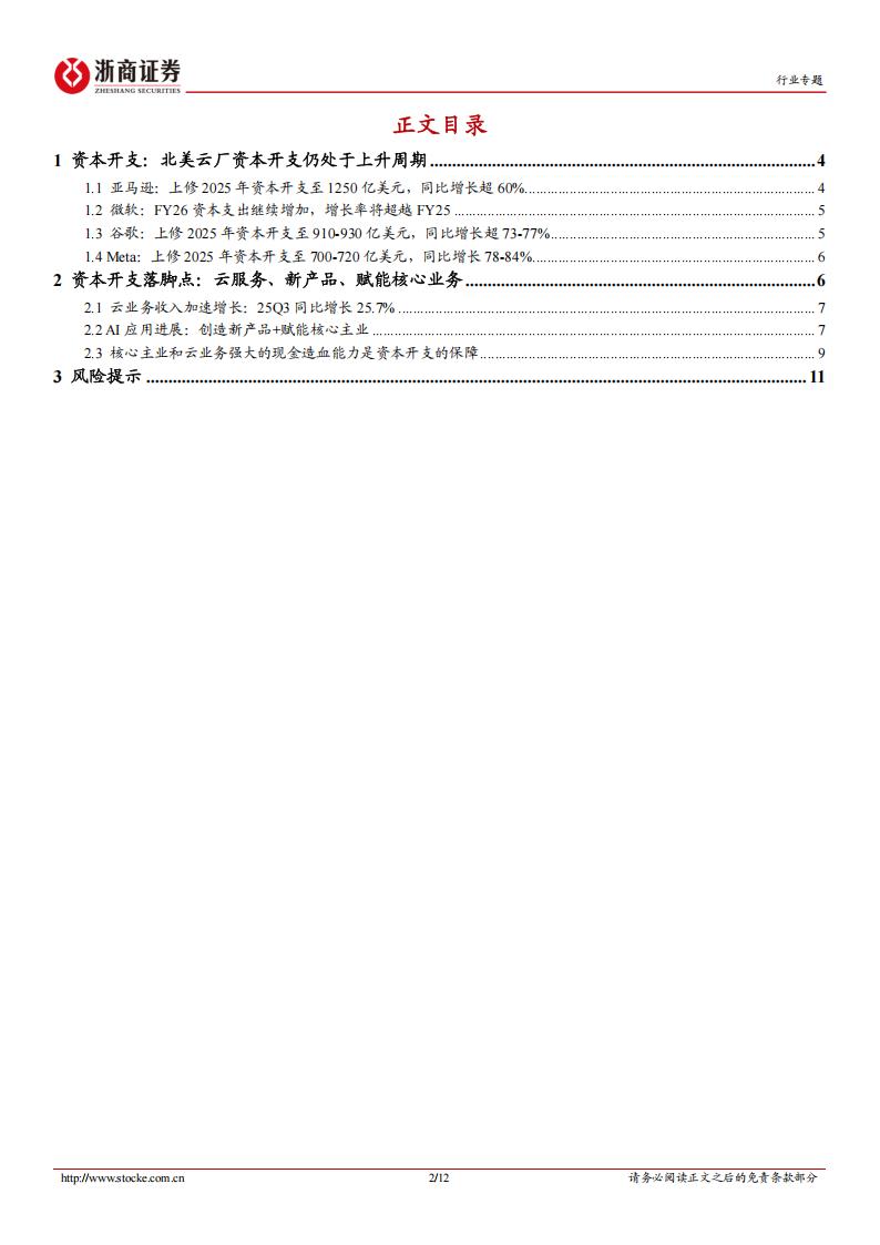 1、AI产业持续提振云业务景气度,北美云厂云业务收入加速增长:25Q3美三大云厂商(Google、微软、亚马逊)云业务营收达到790.6亿美元,同比增长25.7%,高于彭博一致预期2.25%;相较上季度同比增速提升2.59pct。