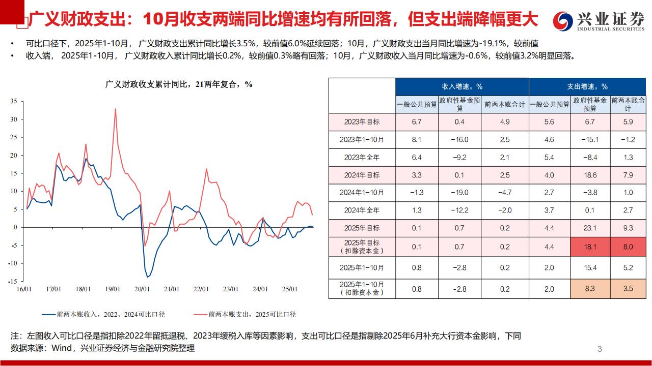 可比口径下,2025年1-10月,广义财政支出累计同比增长3.5%,较前值6.0%延续回落;10月,广义财政支出当月同比增速为-19.1%,较前值收入端,2025年1-10月,广义财政收入累计同比增长0.2%,较前值0.3%略有回落;10月,广义财政收入当月同比增速为-0.6%,较前值3.2%明显回落。