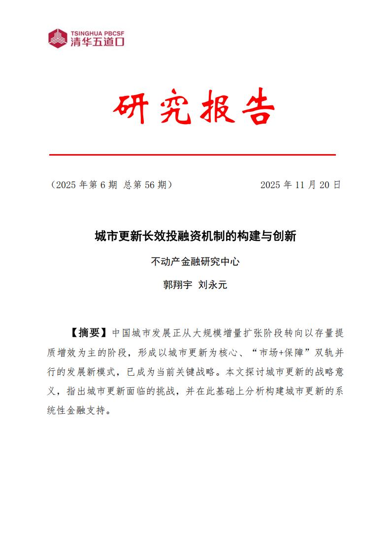 【摘要】中国城市发展正从大规模增量扩张阶段转向以存量提质增效为主的阶段,形成以城市更新为核心、“市场+保障”双轨并行的发展新模式,已成为当前关键战略。本文探讨城市更新的战略意义,指出城市更新面临的挑战,并在此基础上分析构建城市更新的系统性金融支持。