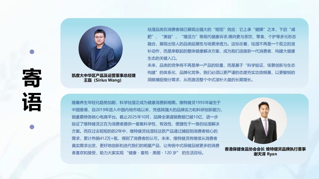 未来,品类的竞争将不再是单一产品的较量,而是基于“科学验证、场景创新与生态构建”的体系化、品牌化竞争。我们必须以更严谨的态度夯实功效根基,以更敏锐的洞察捕捉细分需求,从而激活整个中式滋补大盘的长期增长。随着养生年轻化趋势加剧,科学祛湿正成为健康消费新刚需。维特健灵1993年诞生于中国香港,自2019年进入中国内地市场以来,凭借其强大的品牌实力和科研创新能力,销量霸榜各核心电商平台。截止2025年10月,品牌全渠道销售额已破10亿,进一步验证了维特健灵正在为消费者提供一套集科学性、有效性、便捷性于一身的祛湿解决方案。而在过去短短的的2年中,维特健灵祛湿轻这款产品通过捕捉到消费者核心的需求,累计热销412万+瓶,得到了消费者的认可。未来,维特健灵将继续从消费者真实需求出发,更好地创新和迭代我们的明星产品,让传统中式保健品被更多的消费者喜欢和接受,助力大家实现“健康·喜悦·美丽·120岁”的生活目标。