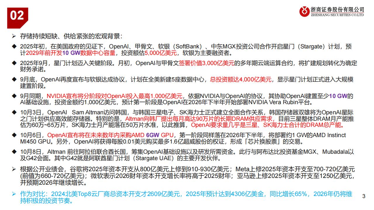 作为对比:2024北美Top8云厂商总资本开支才2609亿美元,2025年预计达到4306亿美金,同比增长65%,2026年仍将维持积极的投资节奏。近几个月美股存储龙头闪迪、美光、西部数据持续大涨,其表面体现的是受近期行业催化事件与政策干预的频繁落地影响,但究其本质,还是行业的整体上游供给减少,天厂产能切入高阶领域,选择性放弃低端内卷市场,下游AI算力需求不断拓增、智能终端端侧增量落地等因素累积作用的结果。