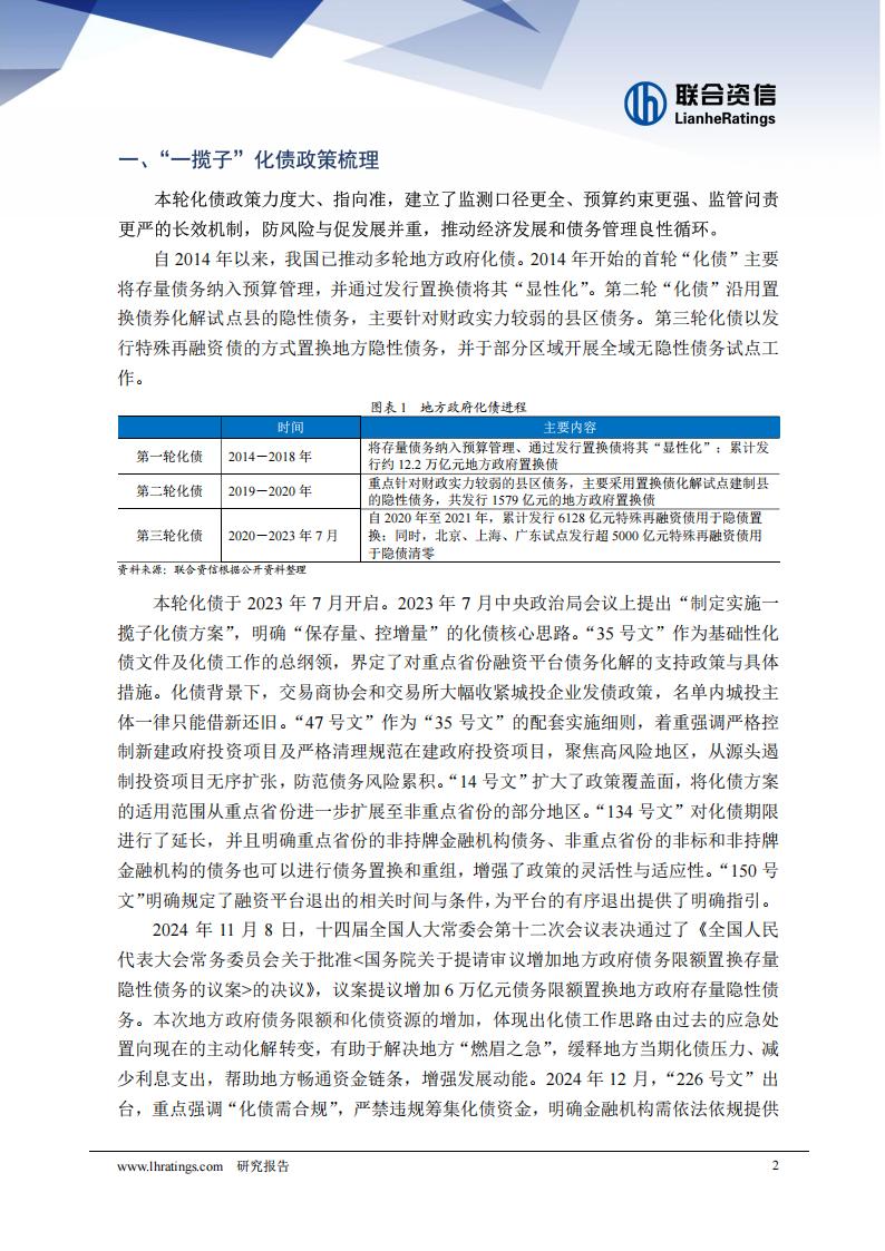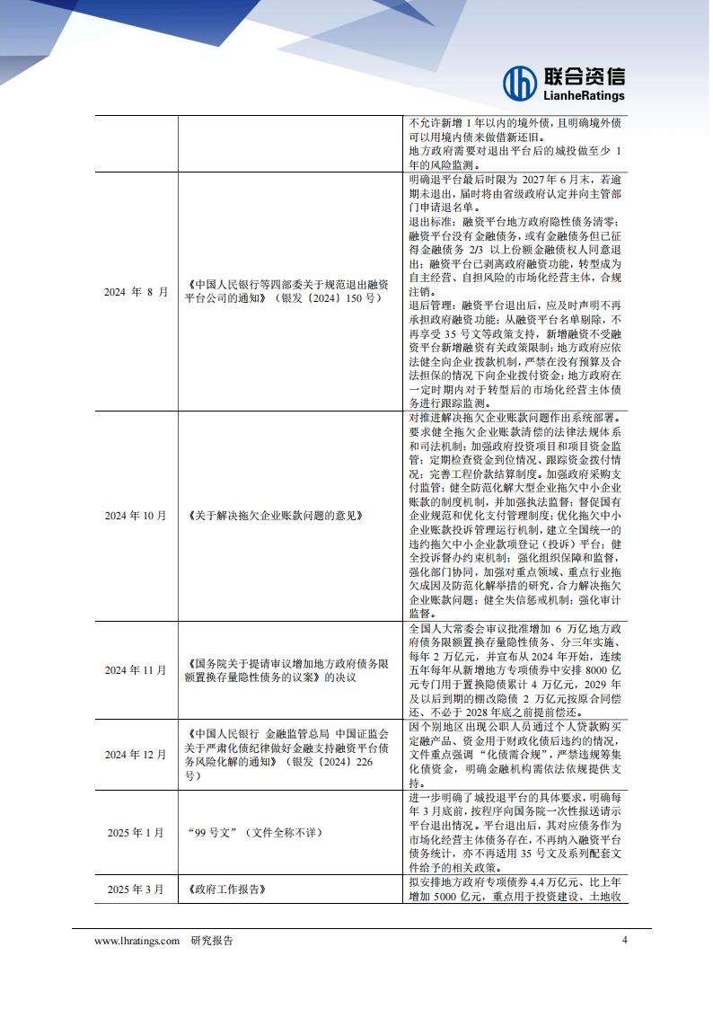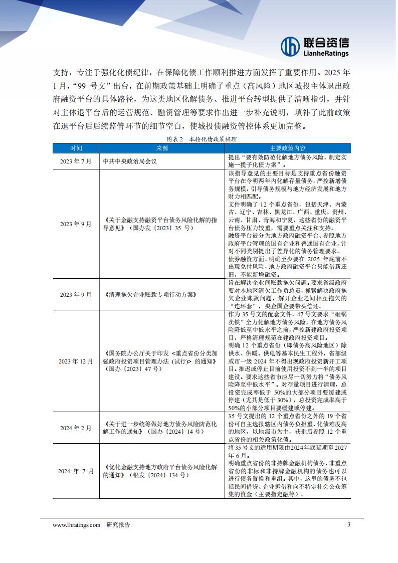 2024年11月8日,十四届全国人大常委会第十二次会议表决通过了《全国人民代表大会常务委员会关于批准<国务院关于提请审议增加地方政府债务限额置换存量隐性债务的议案>的决议》,议案提议增加6万亿元债务限额置换地方政府存量隐性债务。本次地方政府债务限额和化债资源的增加,体现出化债工作思路由过去的应急处置向现在的主动化解转变,有助于解决地方“燃眉之急”,缓释地方当期化债压力、减少利息支出,帮助地方畅通资金链条,增强发展动能。2024年12月,“226号文”出台,重点强调“化债需合规”,严禁违规筹集化债资金,明确金融机构需依法依规提供支持,专注于强化化债纪律,在保障化债工作顺利推进方面发挥了重要作用。2025年1月,“99号文”出台,在前期政策基础上明确了重点(高风险)地区城投主体退出政府融资平台的具体路径,为这类地区化解债务、推进平台转型提供了清晰指引,并针对主体退平台后的运营规范、融资管理等要求作出进一步补充说明,填补了此前政策在退平台后后续监管环节的细节空白,使城投债融资管控体系更加完整。