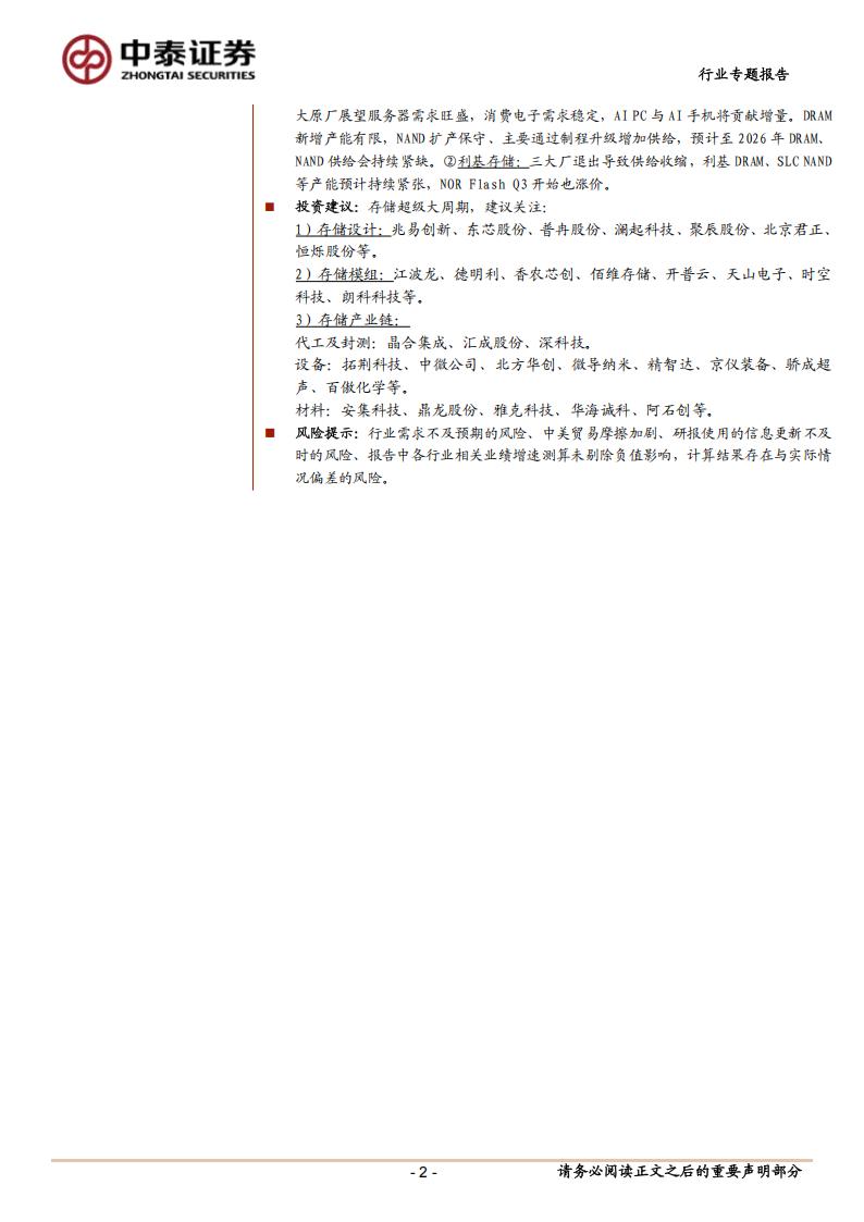 4)展望:AI驱动存储需求高涨,供需紧张或至2026年。①主流存储:受AI驱动,大原厂展望服务器需求旺盛,消费电子需求稳定,AI PC与AI手机将贡献增量。DRAM新增产能有限,NAND扩产保守、主要通过制程升级增加供给,预计至2026年DRAM、NAND供给会持续紧缺。②利基存储:三大厂退出导致供给收缩,利基DRAM、SLC NAND等产能预计持续紧张,NOR Flash Q3开始也涨价。