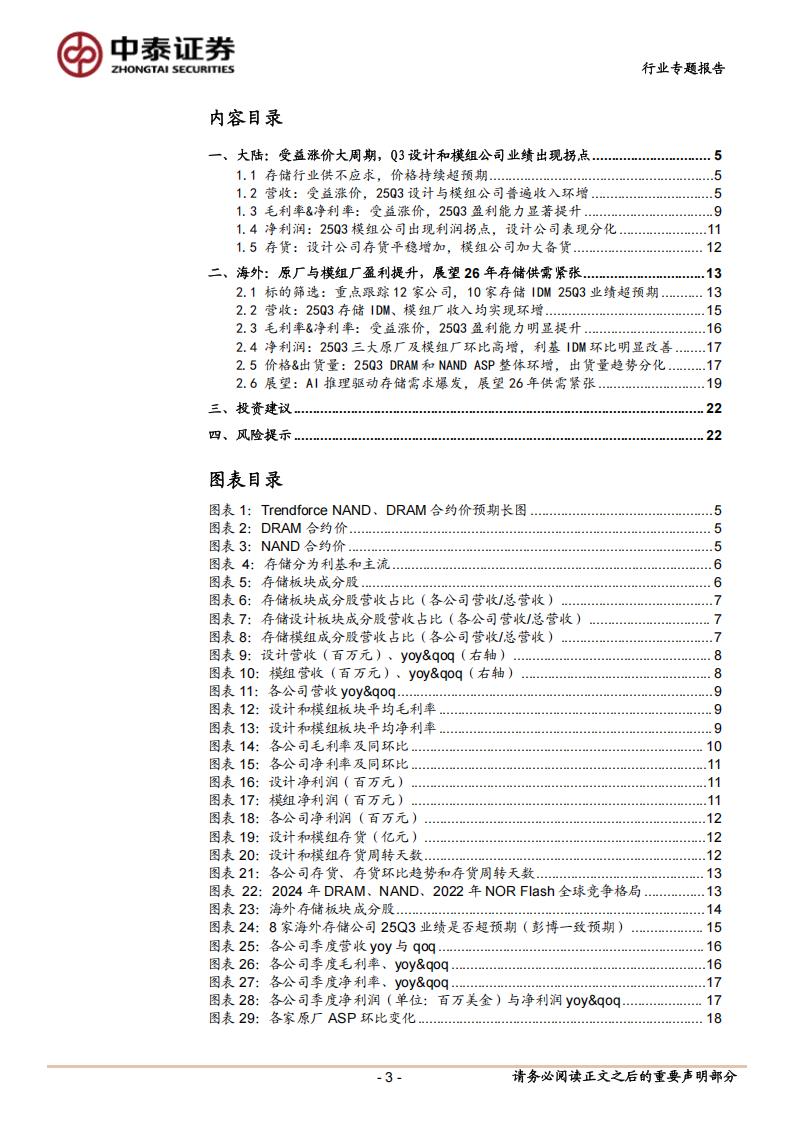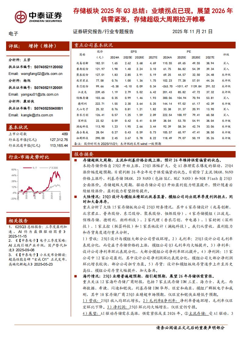本轮存储价格自25Q2开始上涨,25Q3涨幅扩大,受AI推理需求爆发的驱动,25Q涨价幅度超预期,目前判断26年全年处于供需偏紧的状态。目前除了主流DRAM、NAN价格上涨外,利基存储DRAM、2D NAND(包括SLC、MLC NAND)和NOR Flash自25Q:全面涨价。存储超级大周期,驱动存储公司Q3开始盈利能力明显提升,预计随着后续继续涨价,盈利能力有望持续提升。