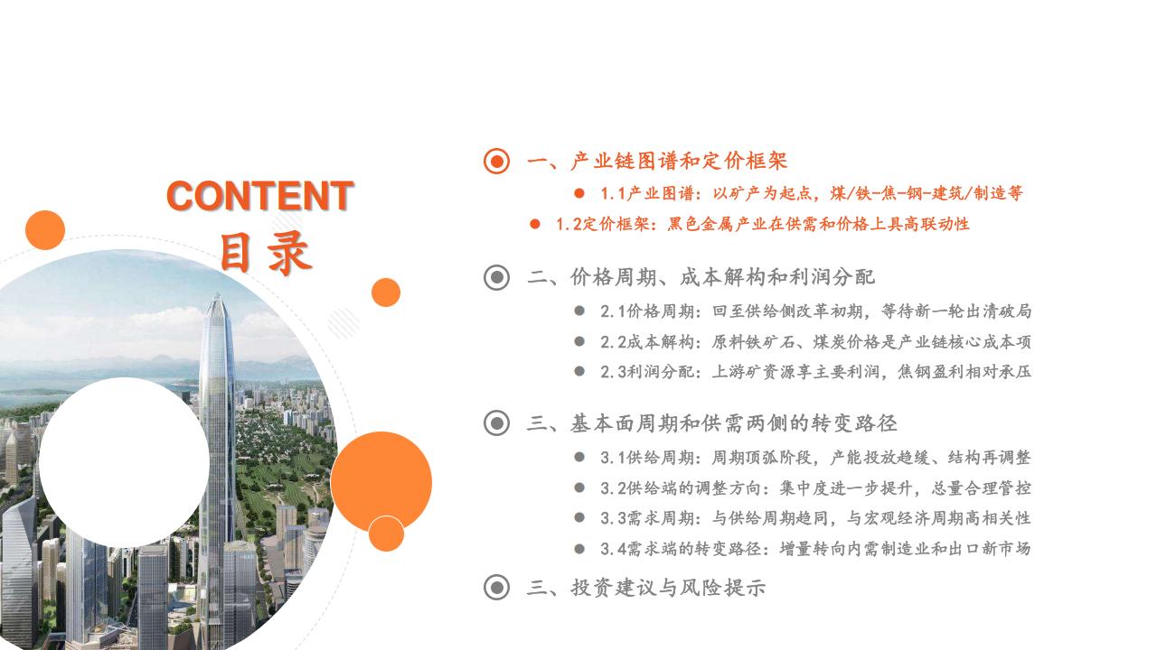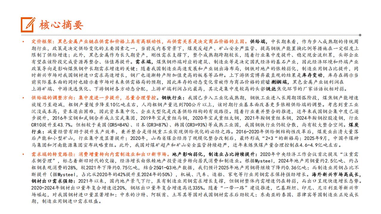 定价框架:黑色金属产业链在供需和价格上具有高联动性,而供需关系是决定商品价格的主因。供给端,中长期来看,作为步入成熟期的传统周期行业,政策是决定供给变化的主要因素之一,当前反内卷背景下,煤炭反超产、矿山安全严监管、提高钢铁产能置换比例等措施在一定程度上限制了供给增速;此外,黑色金属作为长久期资产,刚性需求支撑下,整个成熟期跨期较长,随着行业集中度提升、稳定现金流积累,头部企业有望在该阶段完成资源再整合、估值再提升。需求端,煤焦钢终端对应的建筑、制造业等是决定国民经济的基石产业,因此经济环境和终端产业政策导向是影响煤焦钢中长期需求增速的关键;随着我国制造业高速发展和产业链出海布局,钢铁对地产的依赖弱化,制造业用钢占比提升,同时新兴市场对我国钢材进口需求高速增长,钢厂也逐渐转产附加值更高的板卷等品种。上下游供需博弈最直观的结果是库存变动,库存在揭示当前实际基本面的同时也暗示着市场对未来供需格局的预期,因此库存的动态变化常被作为商品价格的前瞻疱娴端,黑色金属产业链利润在