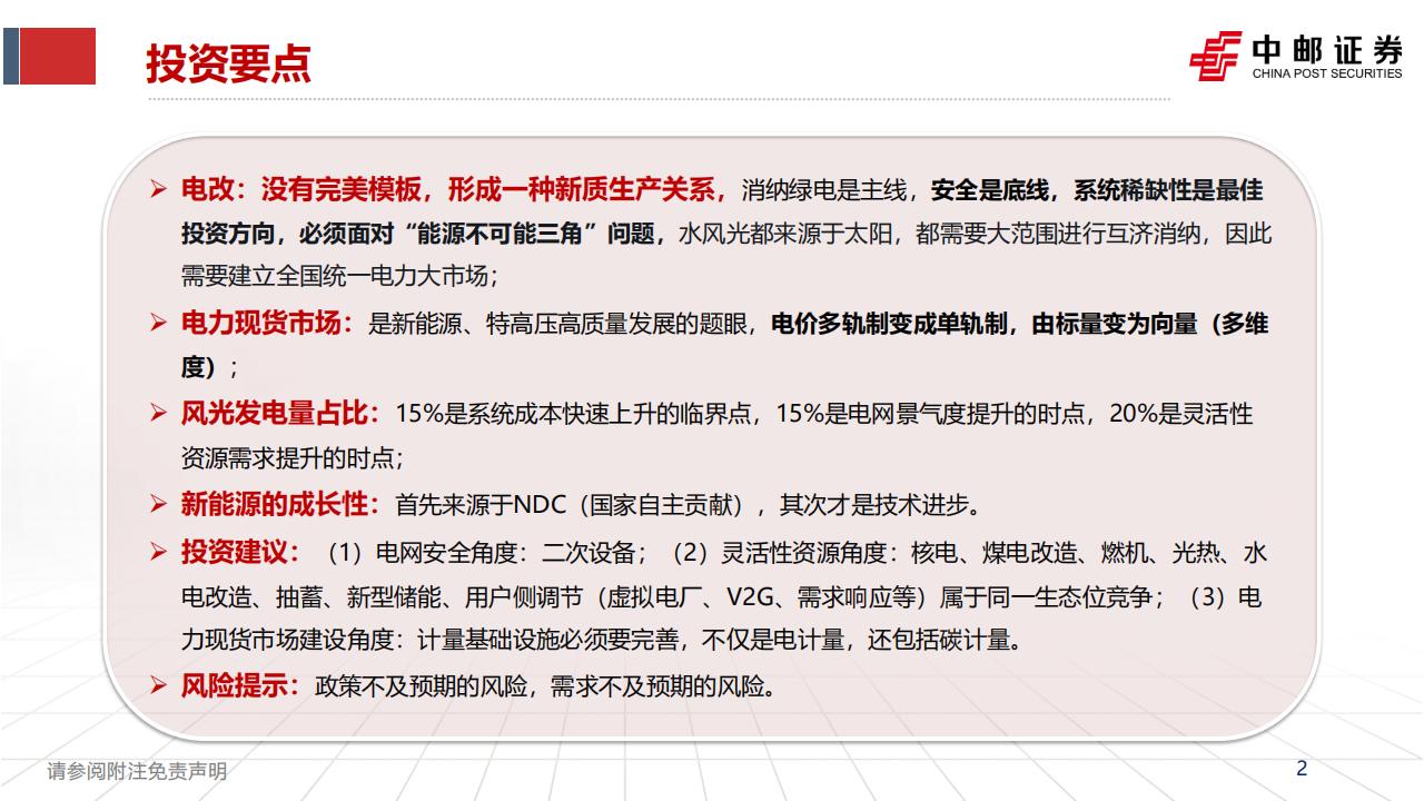 投资建议:(1)电网安全角度:二次设备;(2)灵活性资源角度:核电、煤电改造、燃机、光热、水电改造、抽蓄、新型储能、用户侧调节(虚拟电厂、V2G、需求响应等)属于同一生态位竞争;(3)电力现货市场建设角度:计量基础设施必须要完善,不仅是电计量,还包括碳计量。
