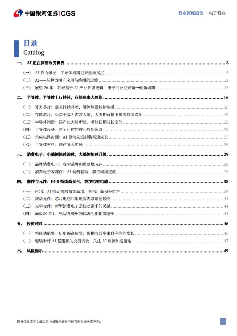 成长中,预计2026年趋势保持。看好的几个方向:①算力国产化大势所趋,关注国产算力芯片。②AI+有望驱动消费电子进入新一轮成长周期,这将拉动消费电子处理器等半导体零部件的销售。③存储芯片受益于算力需求大增,供需缺口迎来大周期。④受AI HPC需求拉动,半导体制造板块正处于新一轮增长周期中。⑤在AI和HBM需求浪潮下,持续看好半导体国产装备板块。⑥半导体材料行业将保持量价齐升趋势,看好光刻胶、CMP抛光材料、湿电子化学品等领域相关投资机会。