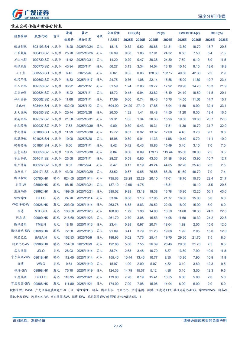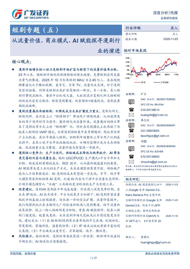 未来IP版权、Al技术进步、平台与政策多方加持下,AI漫剧有望在量级跃升的基础上继续提质,迎来进一步的受众扩圈、流量价值提升。我们观察到此次各互联网大厂均快速积极涌入漫剧赛道,给予流量和政策扶持,较上一轮入场短剧更为积极。考虑AI赋能制作,较真人短剧门槛更低,起量或更快,未来漫剧市场天花板或比目前设想更为乐观。建议关注:(1)在Al短剧/漫剧有业务布局的中文在线、欢瑞世纪、华策影视、掌趣科技、海看股份等;(2)IP端关注版权资源丰富的阅文集团;(3)平台端关注爱奇艺、芒果超媒、快手、腾讯等。