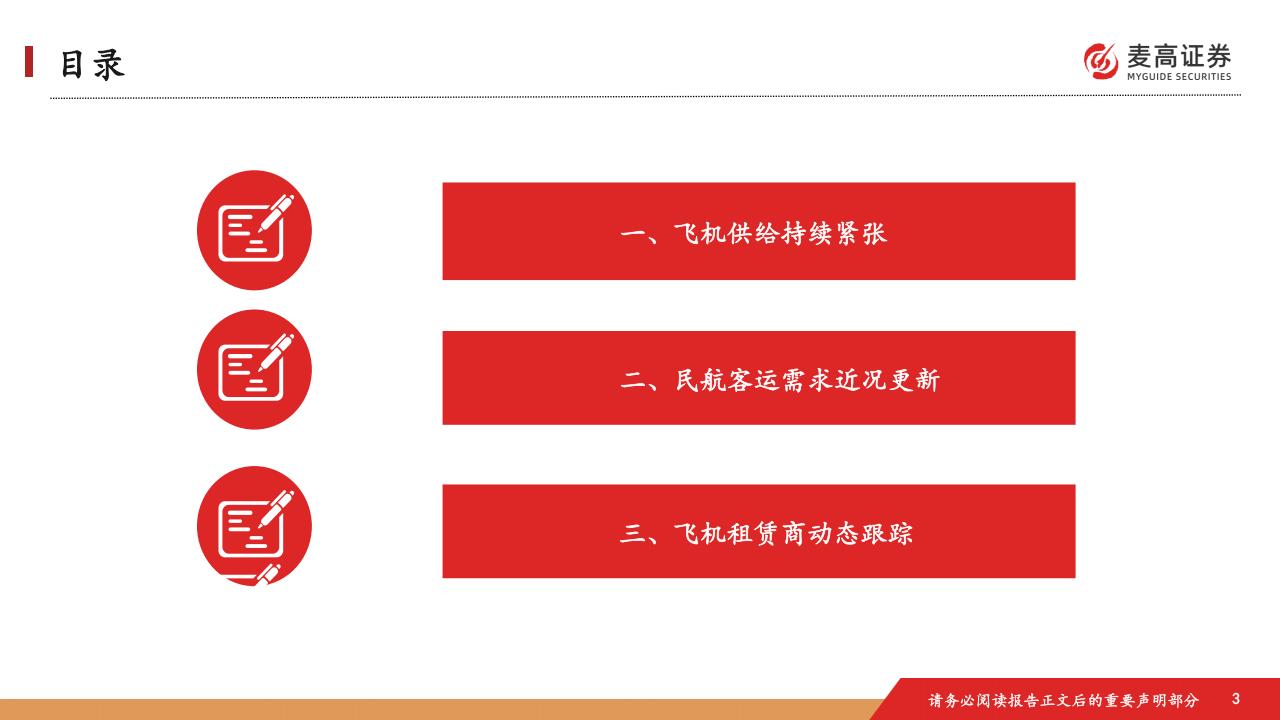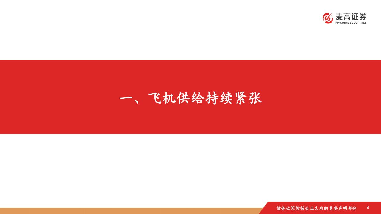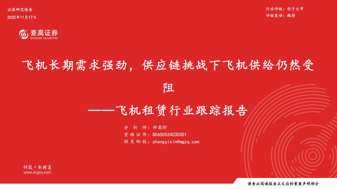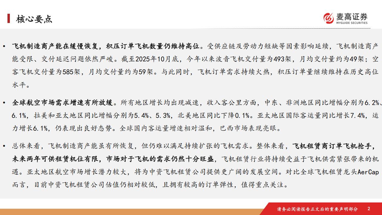 飞机制造商产能在缓慢恢复,积压订单飞机数量仍维持高位。受供应链及劳动力短缺等因素影响延续,飞机制造商产全球航空市场需求增速有所放缓。所有地区增长均出现减速,收入客公里方面,中东、非洲地区同比增幅分别为6.2%总体来看,飞机制造商产能虽有所恢复,但仍难以满足持续扩张的飞机需求。整体来看,飞机租赁商订单飞机抢手,能受限、交付延迟问题依然严峻。截至2025年10月底,今年以来波音飞机交付量为493架,月均交付量约为49架;空6.1%,拉美和亚太地区同比增幅分别为5.4%、5.3%,北美地区同比下降0.1%。亚太地区国际客运量同比增长7.4%,运未来两年可供租赁机位有限,市场对于飞机的需求仍然十分旺盛,飞机租赁行业将持续受益于飞机供需紧张带来的机客飞机交付量为585架,月均交付量约为59架。与此同时,飞机订单需求持续火热,积压订单量继续维持在历史高位力增长6.1%,仍表现出良好态势。全球国内客运量增速相对温和,巴西市场表现亮眼。遇。亚太地区航空市场增长潜力较大,将为中资飞机租赁公司提供更广阔的发展空间。对比全球飞机租赁龙头AerCap水平。而言,目前中资飞机租赁公司估值仍相对较低,且拥有较高的订单弹性,值得重点关注。今年以来,波音飞机交付量较去年同期显著改善,空客飞机交付量略好于去年同期水平,两家头部飞机制造商交付水平远不及此前高位水平。截至2025年10月底,今年以来波音飞机交付量为493架,月均交付量约为49架;空客飞机交付量为585架,月均交付量约为59架。