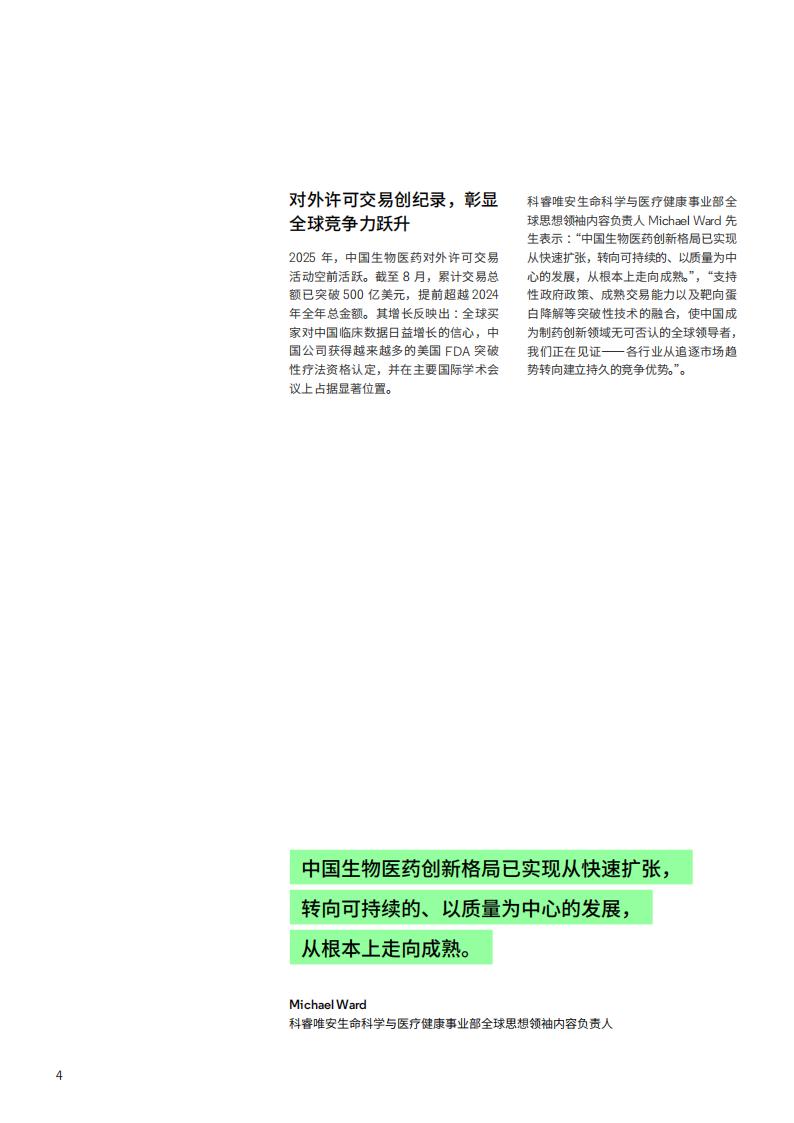 2025年,中国生物医药对外许可交易活动空前活跃。截至8月,累计交易总额已突破500亿美元,提前超越2024年全年总金额。其增长反映出:全球买家对中国临床数据日益增长的信心,中国公司获得越来越多的美国FDA突破性疗法资格认定,并在主要国际学术会议上占据显著位置。科睿唯安生命科学与医疗健康事业部全球思想领袖内容负责人Michael Ward先生表示:“中国生物医药创新格局已实现从快速扩张,转向可持续的、以质量为中心的发展,从根本上走向成熟。”,“支持性政府政策、成熟交易能力以及靶向蛋白降解等突破性技术的融合,使中国成为制药创新领域无可否认的全球领导者,我们正在见证——各行业从追逐市场趋势转向建立持久的竞争优势。”。