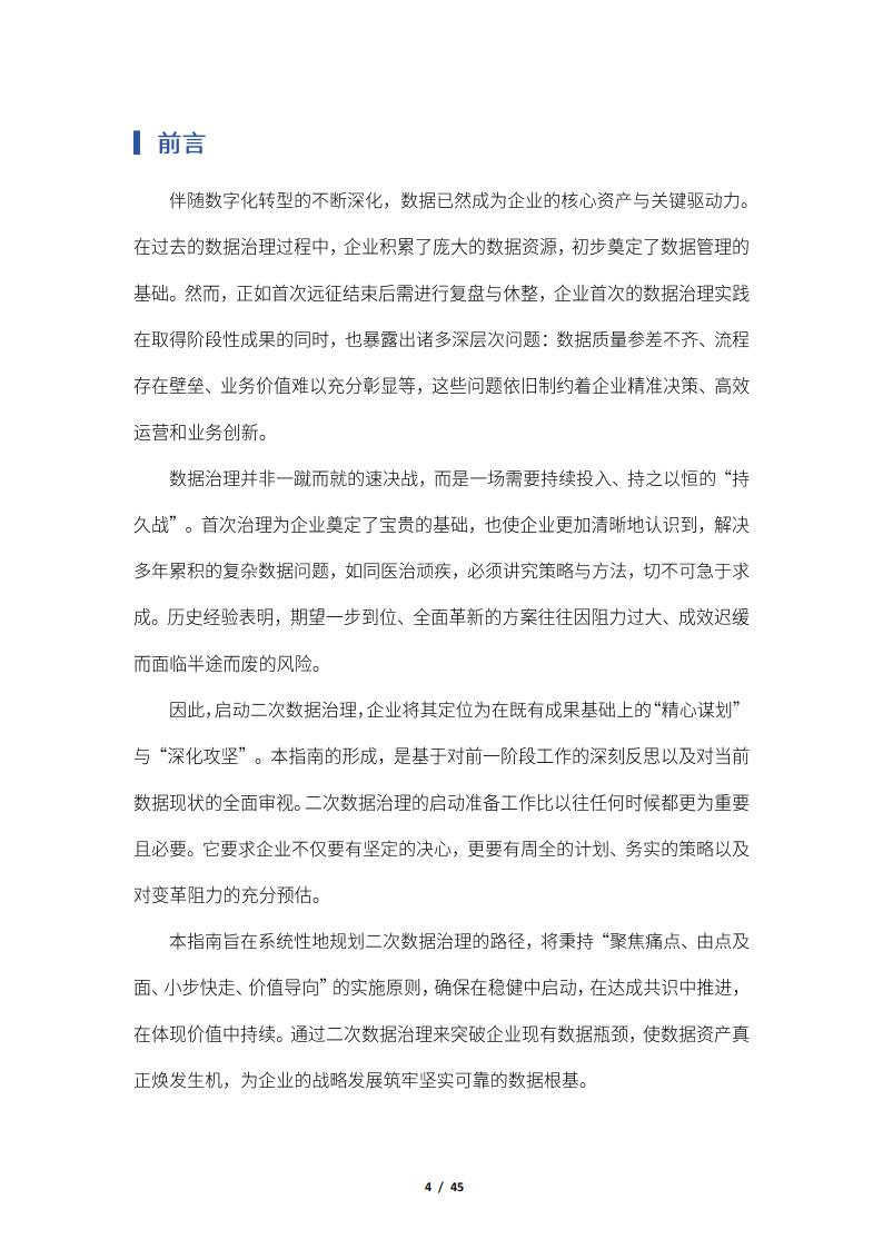 本指南旨在系统性地规划二次数据治理的路径,将秉持“聚焦痛点、由点及面、小步快走、价值导向”的实施原则,确保在稳健中启动,在达成共识中推进,在体现价值中持续。通过二次数据治理来突破企业现有数据瓶颈,使数据资产真正焕发生机,为企业的战略发展筑牢坚实可靠的数据根基。