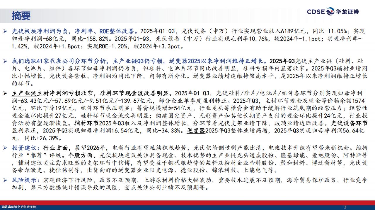 我们选取41家代表公司分环节分析,主产业链Q3仍亏损,逆变器2025以来净利润维持正增长。2025年Q3光伏主产业链(硅料、硅片、电池片、组件)各环节归母净利涧仍为负,但硅料、电池片环节同比改善明显,硅料亏损年内显著收窄。2025年Q3辅材业绩同比小幅增长,光伏设备营收、净利润均同比下降,内部有所分化。逆变器业绩增速维持较高水平,是2025年以来净利润维持正增长的环节。