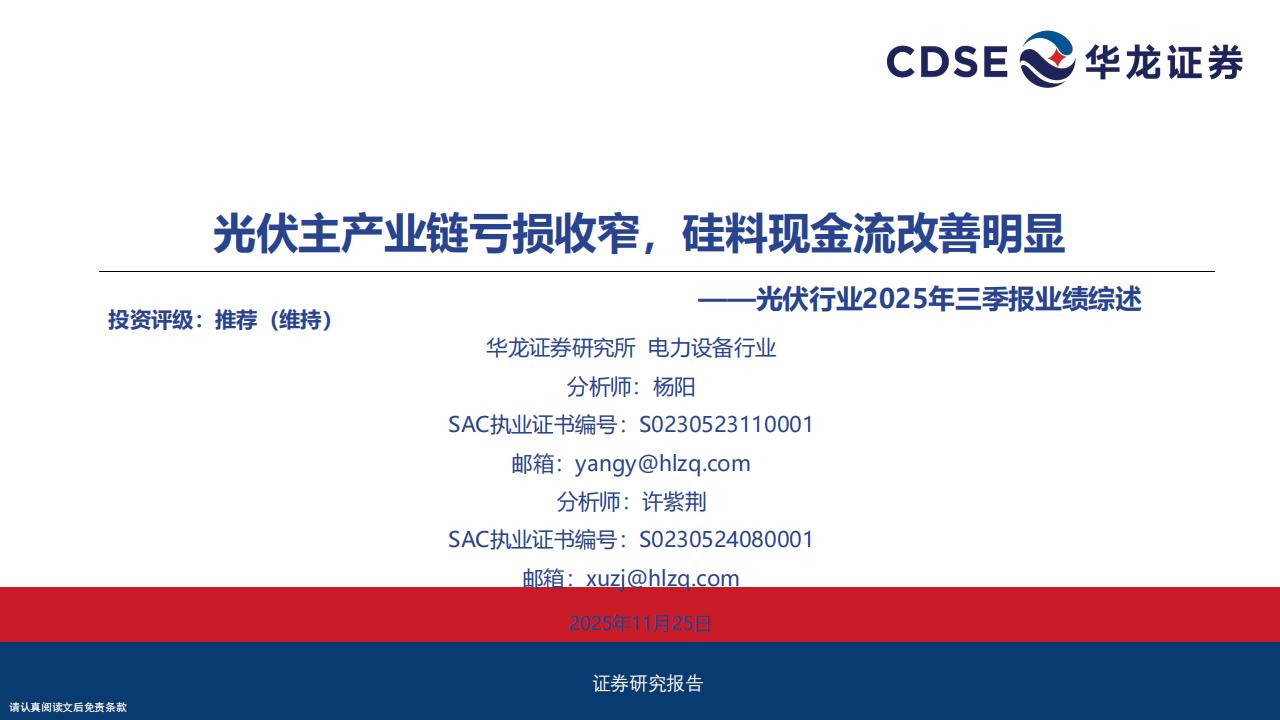主产业链主材净利润亏损收窄,硅料环节现金流改善明显。2025年Q1-Q3,光伏硅料/硅片/电池片/组件各环节分别实现归母净利润-63.43亿元/-57.69亿元/-9.51亿元/-139.67亿元,部分企业单季度盈利转正。2025年Q3,主材环节现金及现金等价物余额1574亿元,环比下降19亿元,组件环节承压明显;筹资规模增加54亿元,行业龙头筹措资金有助于缓解行业筑底期的经营压力;经营性现金流环比提升27亿元,硅料环节现金流改善明显;购建固定资产、无形资产和其他长期资产支付的现金环比提升24亿元,行业投资活动有望逐渐恢复。辅材环节2025年Q3收入及净利润整体增长,分环节看光伏支架业绩下降,玻璃业绩边际改善。光伏设备环节盈利承压,2025年Q3实现归母净利润16.54亿元,同比-34.33%。逆变器2025年Q3整体业绩高增,2025年Q3实现归母净利涧56.64亿元,同比+26.39%。