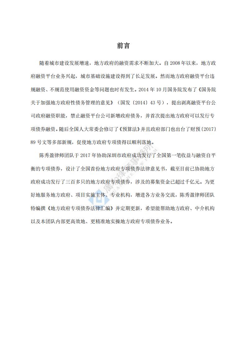 陈秀盈律师团队于2017年协助深圳市政府成功发行了全国第一笔收益与融资自平衡的专项债券,设计了全国首份地方政府专项债券法律意见书,截至目前已协助地方政府成功发行了三百多只的地方政府专项债券,涉及的募集资金已超过千亿元。为更好地服务地方政府、项目实施主体、专业机构,增进各方业务交流,陈秀盈律师团队特编撰《地方政府专项债券法律汇编》并定期更新,希望能帮助地方政府、中介机构以及本团队内部更高效地、更精准地实操地方政府专项债券业务。