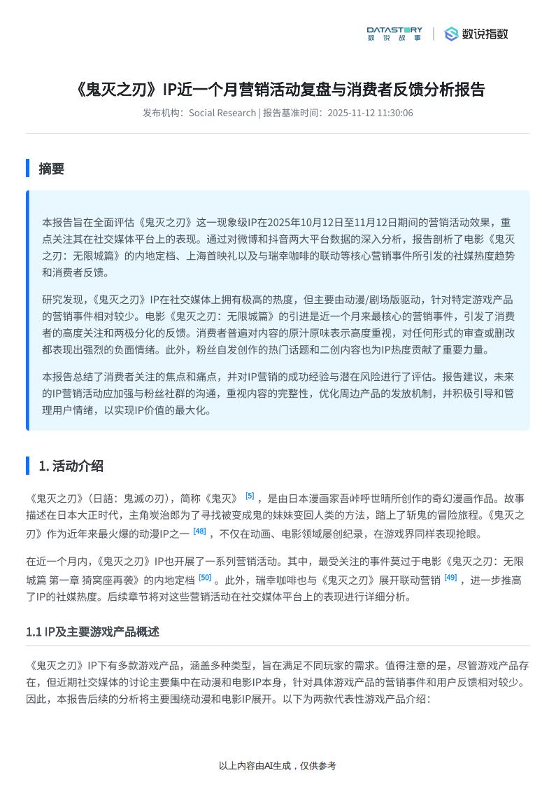 本报告旨在全面评估《鬼灭之刃》这一现象级IP在2025年10月12日至11月12日期间的营销活动效果,重点关注其在社交媒体平台上的表现。通过对微博和抖音两大平台数据的深入分析,报告剖析了电影《鬼灭之刃:无限城篇》的内地定档、上海首映礼以及与瑞幸咖啡的联动等核心营销事件所引发的社媒热度趋势和消费者反馈。