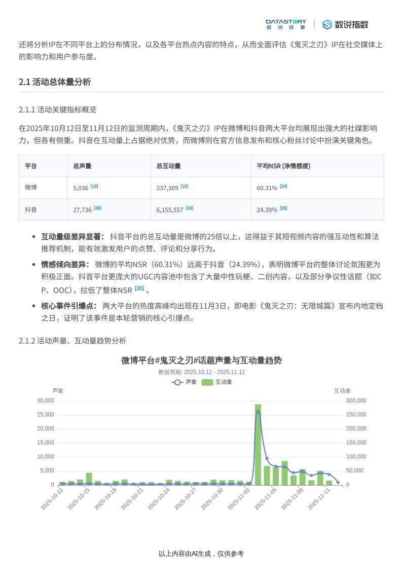 2.1.1活动关键指标概览在2025年10月12日至11月12日的监测周期内,《鬼灭之刃》IP在微博和抖音两大平台均展现出强大的社媒影响力,但各有侧重。抖音在互动量上占据绝对优势,而微博则在官方信息发布和核心粉丝讨论中扮演关键角色。