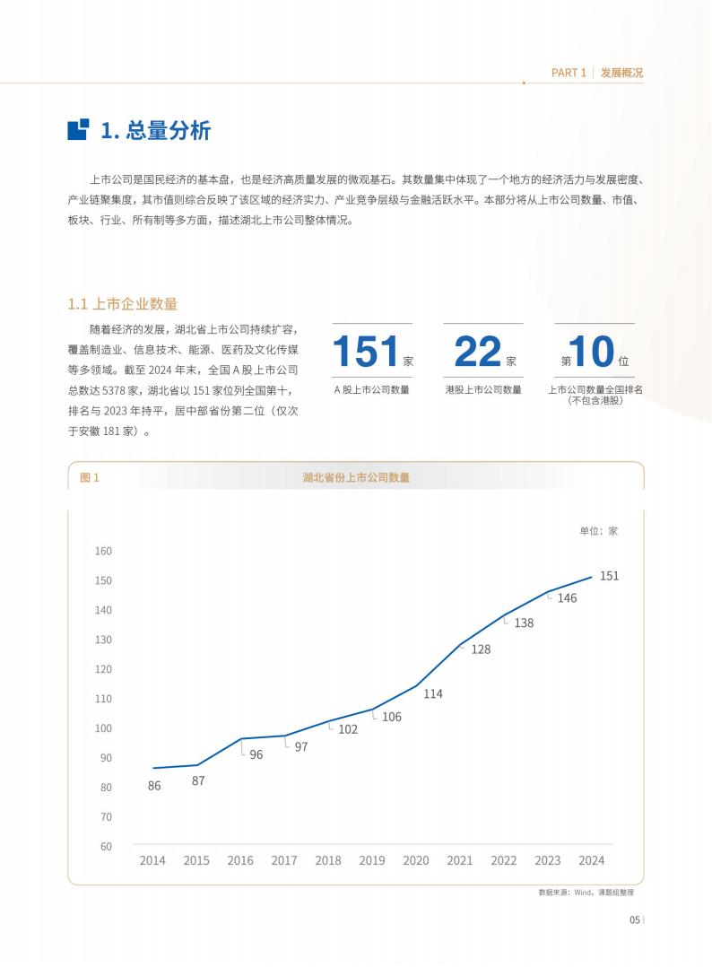 上市公司是国民经济的基本盘,也是经济高质量发展的微观基石。其数量集中体现了一个地方的经济活力与发展密度、产业链聚集度,其市值则综合反映了该区域的经济实力、产业竞争层级与金融活跃水平。本部分将从上市公司数量、市值板块、行业、所有制等多方面,描述湖北上市公司整体情况。