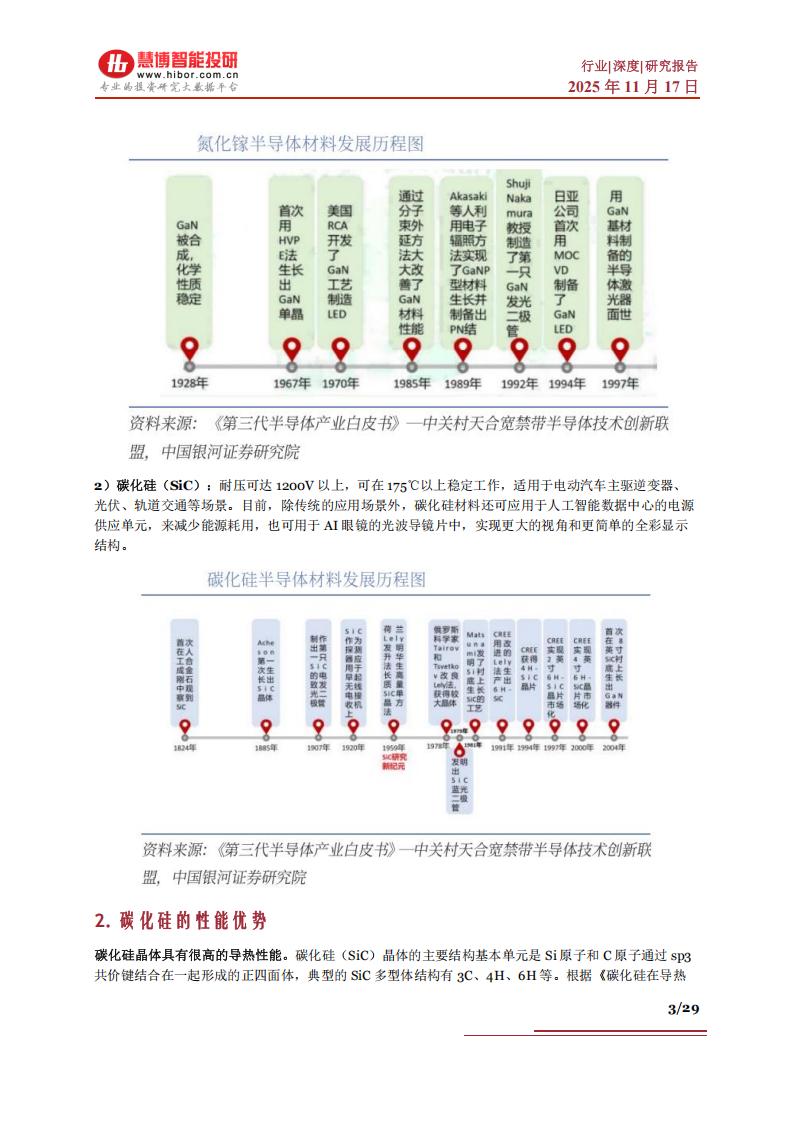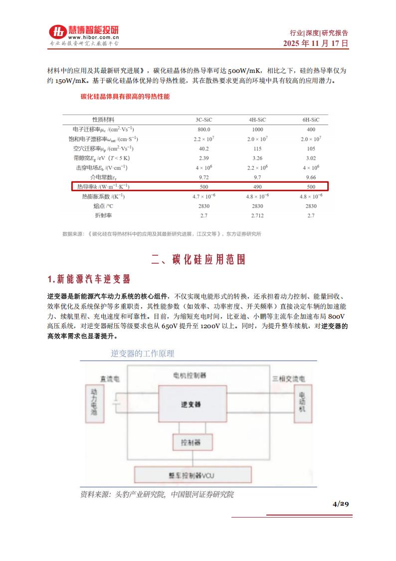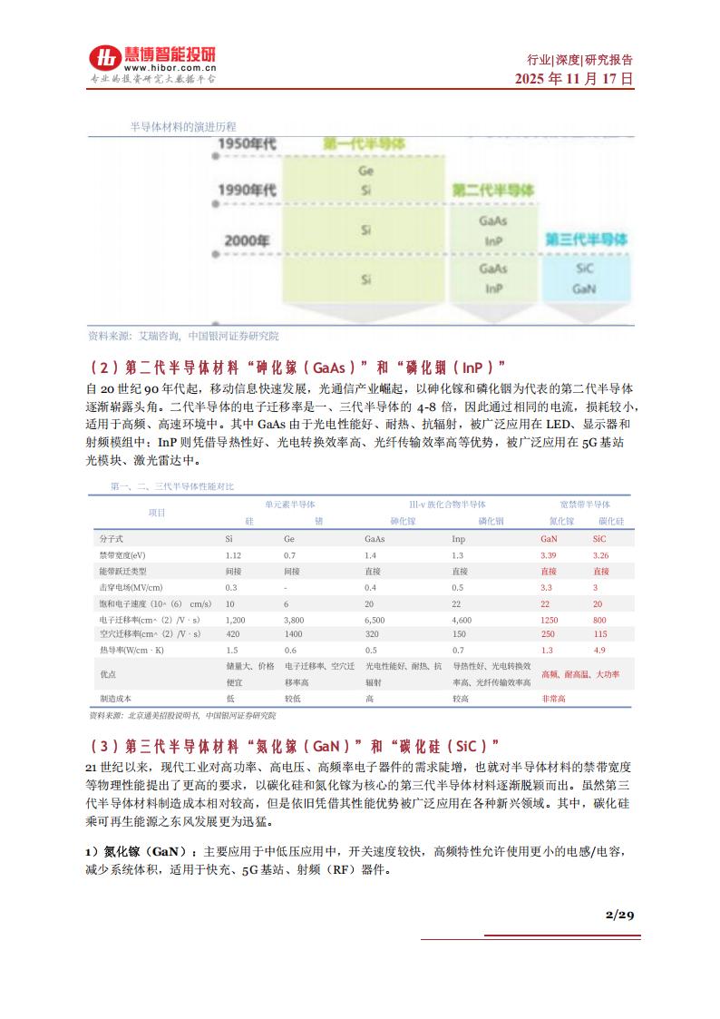2)碳化硅(SiC):耐压可达1200V以上,可在175℃以上稳定工作,适用于电动汽车主驱逆变器、光伏、轨道交通等场景。目前,除传统的应用场景外,碳化硅材料还可应用于人工智能数据中心的电源供应单元,来减少能源耗用,也可用于AI眼镜的光波导镜片中,实现更大的视角和更简单的全彩显示结构。