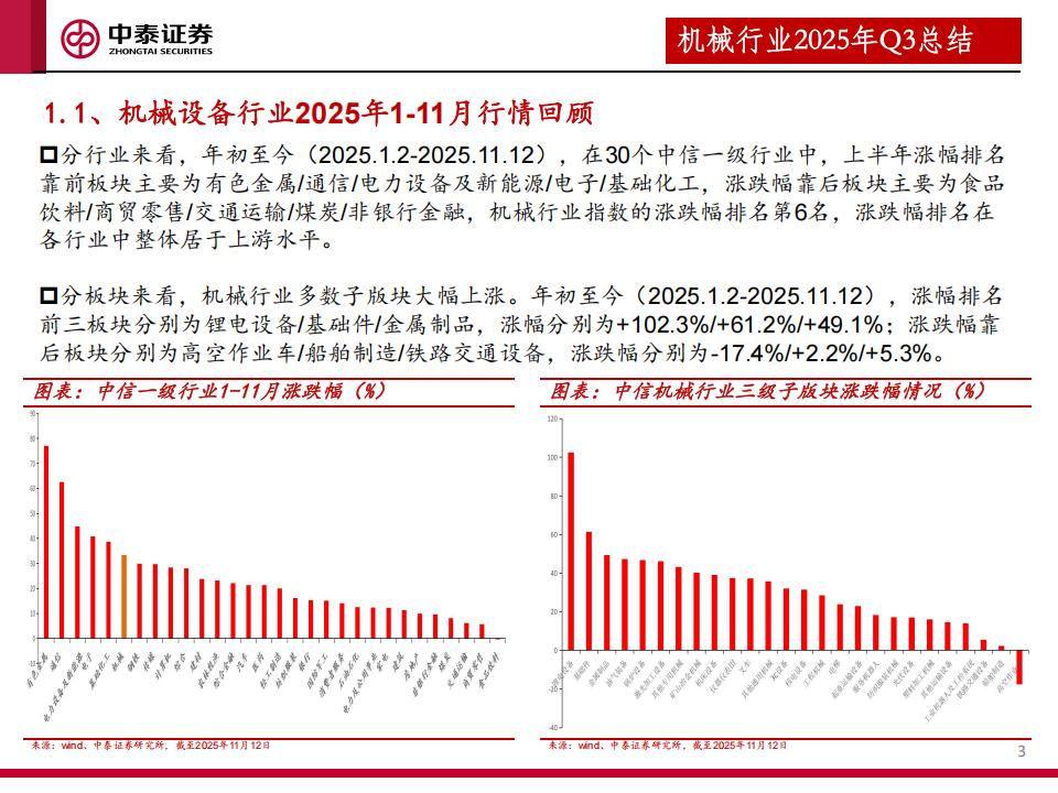 □分行业来看,年初至今(2025.1.2-2025.11.12),在30个中信一级行业中,上半年涨幅排名靠前板块主要为有色金属/通信/电力设备及新能源/电子/基础化工,涨跌幅靠后板块主要为食品饮料/商贸零售/交通运输/煤炭/非银行金融,机械行业指数的涨跌幅排名第6名,涨跌幅排名在各行业中整体居于上游水平。