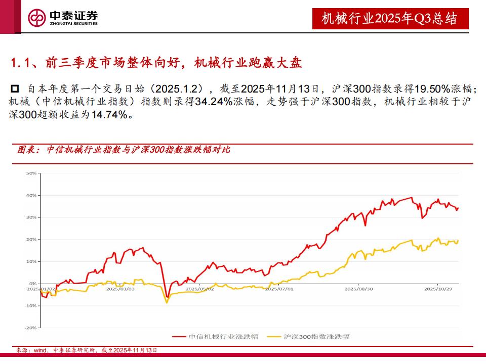□自本年度第一个交易日始(2025.1.2),截至2025年11月13日,沪深300指数录得19.50%涨幅;机械(中信机械行业指数)指数则录得34.24%涨幅,走势强于沪深300指数,机械行业相较于沪深300超额收益为14.74%。