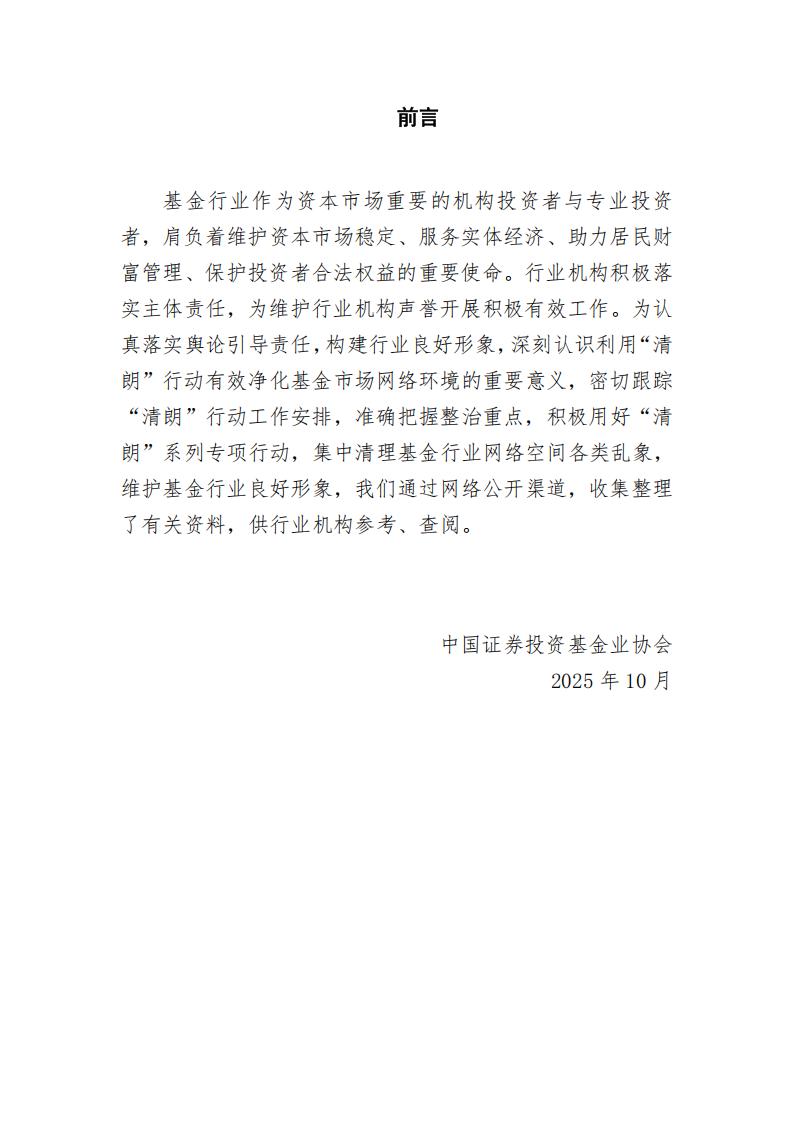 基金行业作为资本市场重要的机构投资者与专业投资者,肩负着维护资本市场稳定、服务实体经济、助力居民财富管理、保护投资者合法权益的重要使命。行业机构积极落实主体责任,为维护行业机构声誉开展积极有效工作。为认真落实舆论引导责任,构建行业良好形象,深刻认识利用“清朗”行动有效净化基金市场网络环境的重要意义,密切跟踪“清朗”行动工作安排,准确把握整治重点,积极用好“清朗”系列专项行动,集中清理基金行业网络空间各类乱象,维护基金行业良好形象,我们通过网络公开渠道,收集整理了有关资料,供行业机构参考、查阅。