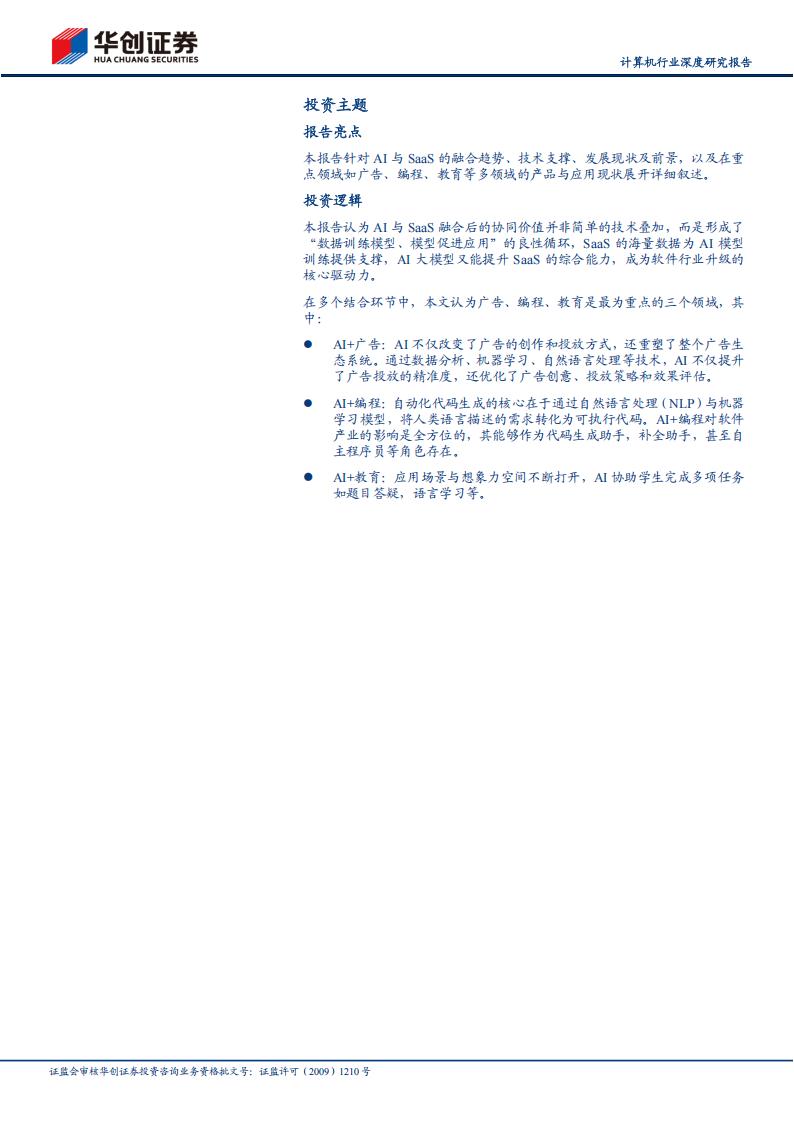 本报告针对AI与SaaS的融合趋势、技术支撑、发展现状及前景,以及在重点领域如广告、编程、教育等多领域的产品与应用现状展开详细叙述。